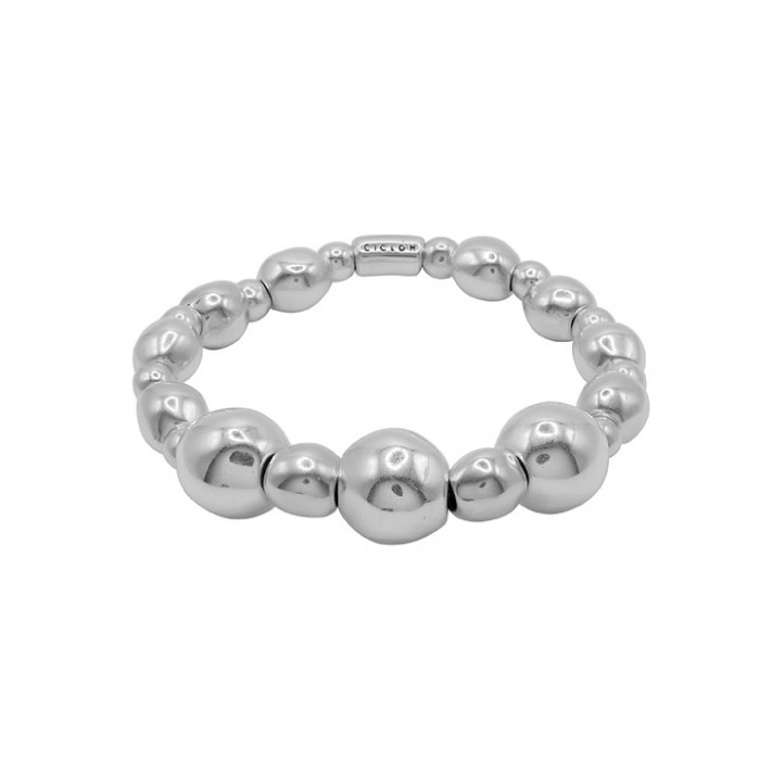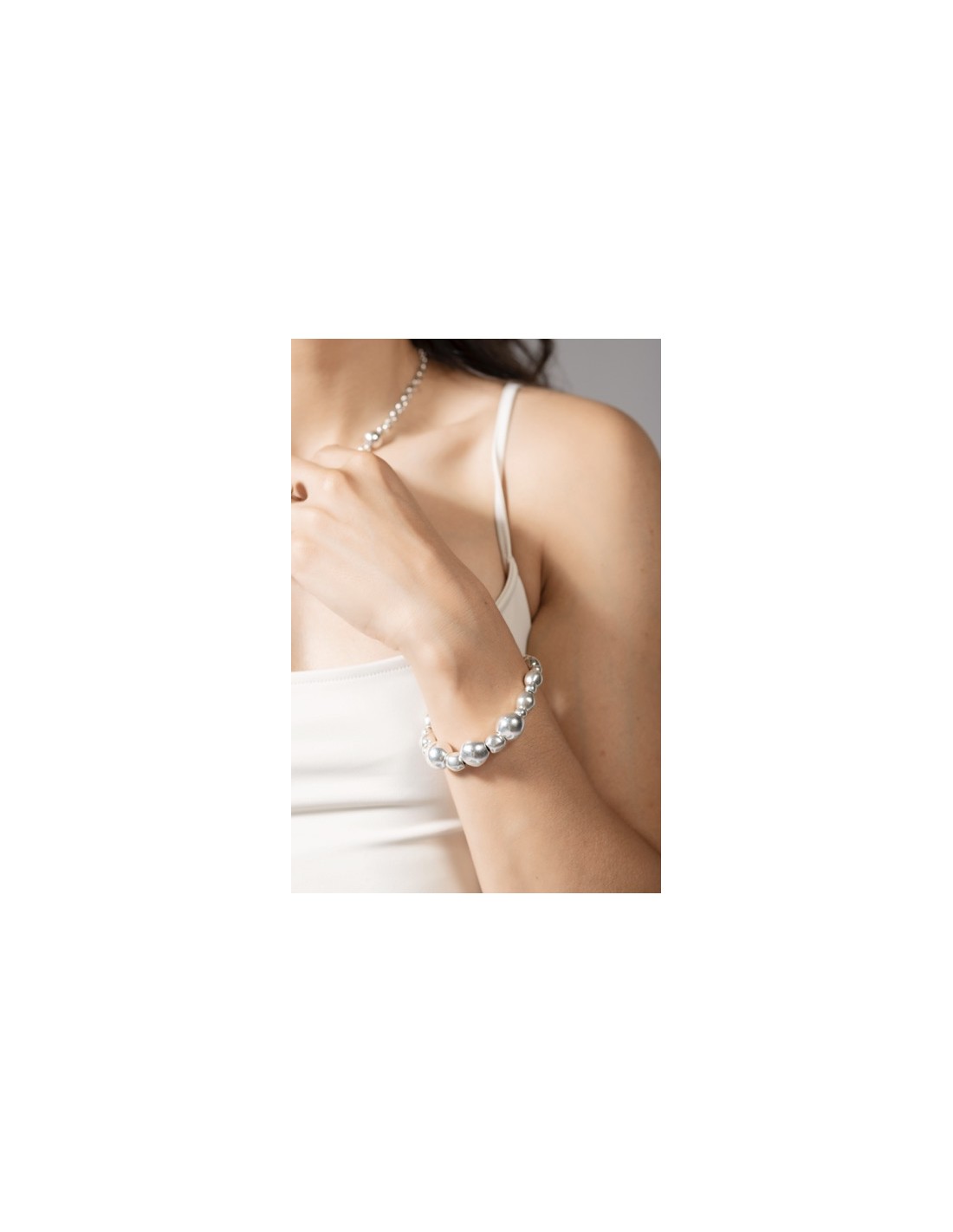La Pulsera Palas es elástica y bañada en plata, diseñada con esferas en tres tamaños que se combinan creando ritmo y contraste. Su estilo versátil la convierte en una pieza ideal para llevar a diario o realzar un conjunto especial. Disponible en dos tallas.