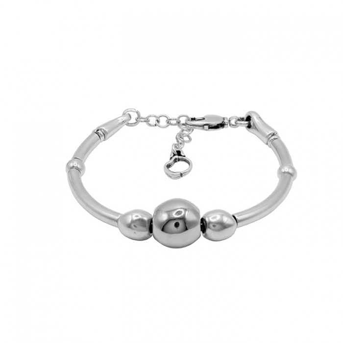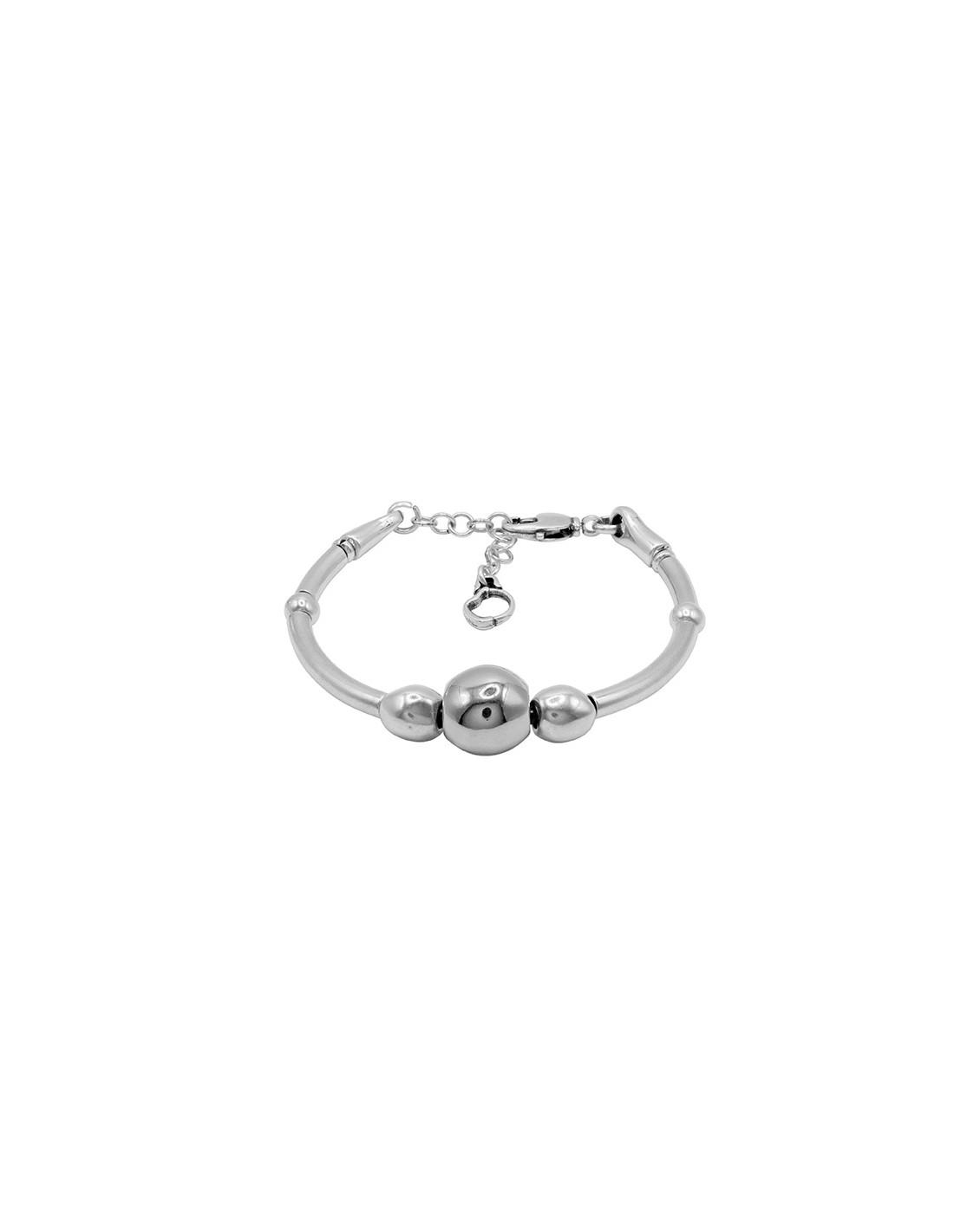 La Pulsera Apolo está bañada en plata y diseñada con tubos que enmarcan un motivo central formado por esferas de dos tamaños. Su cierre de mosquetón permite ajustarla de 17 a 21 cm, convirtiéndola en una pieza versátil y elegante que aporta un toque de estilo contemporáneo a cualquier look.
