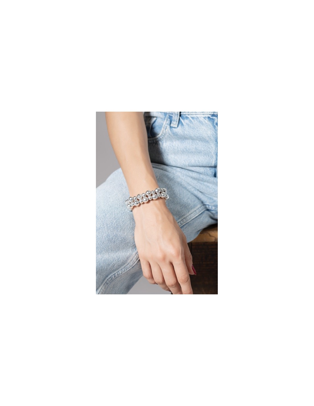 La Pulsera Pléyades está elaborada en cuero y decorada con piezas bañadas en plata. Su diseño doble destaca por la combinación de esferas en dos tamaños, creando un efecto dinámico y elegante. Con cierre en forma de T y ajustable de 17 a 21 cm, es una joya versátil que aporta carácter y estilo a cualquier ocasión.