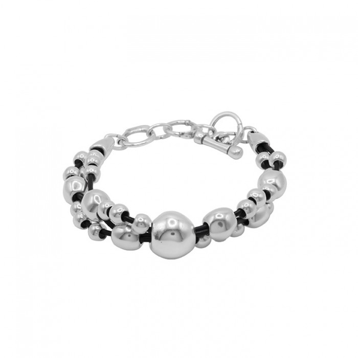 La Pulsera Oberón está formada por cuero entrelazado decorado con esferas bañadas en plata de varios tamaños. En el centro destaca una esfera más grande que se convierte en el foco del diseño. Su cierre en forma de T y su medida ajustable de 17 a 21 cm la hacen cómoda y versátil, perfecta para quienes buscan un estilo con carácter y distinción.