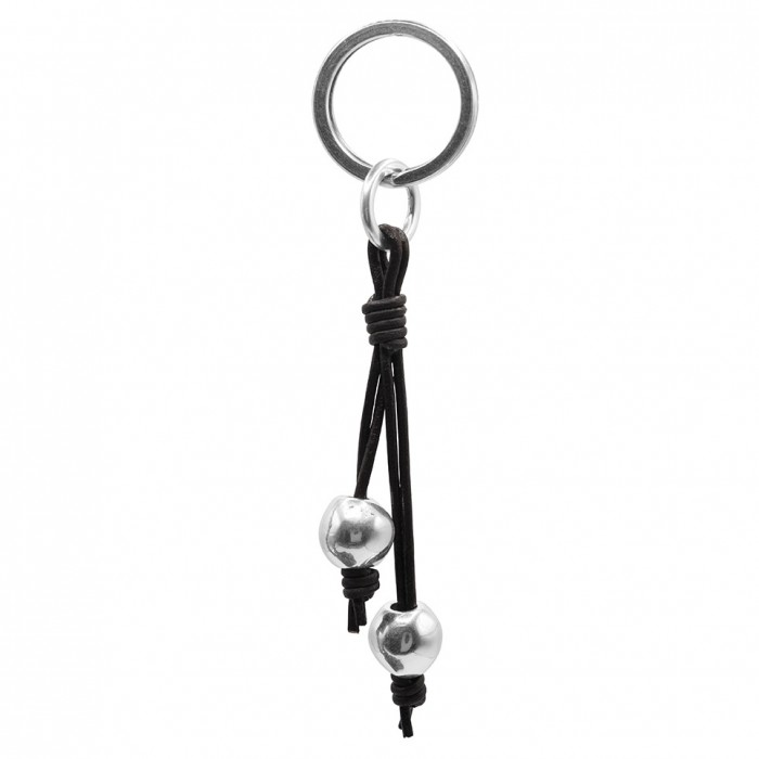 El Llavero o Bag Charm Eclipse está elaborado con dos cordones de cuero y decorado con dos esferas bañadas en plata. Con una medida de 12 cm, es un accesorio práctico y sofisticado, perfecto para acompañar tus llaves o dar un toque único a tu bolso.