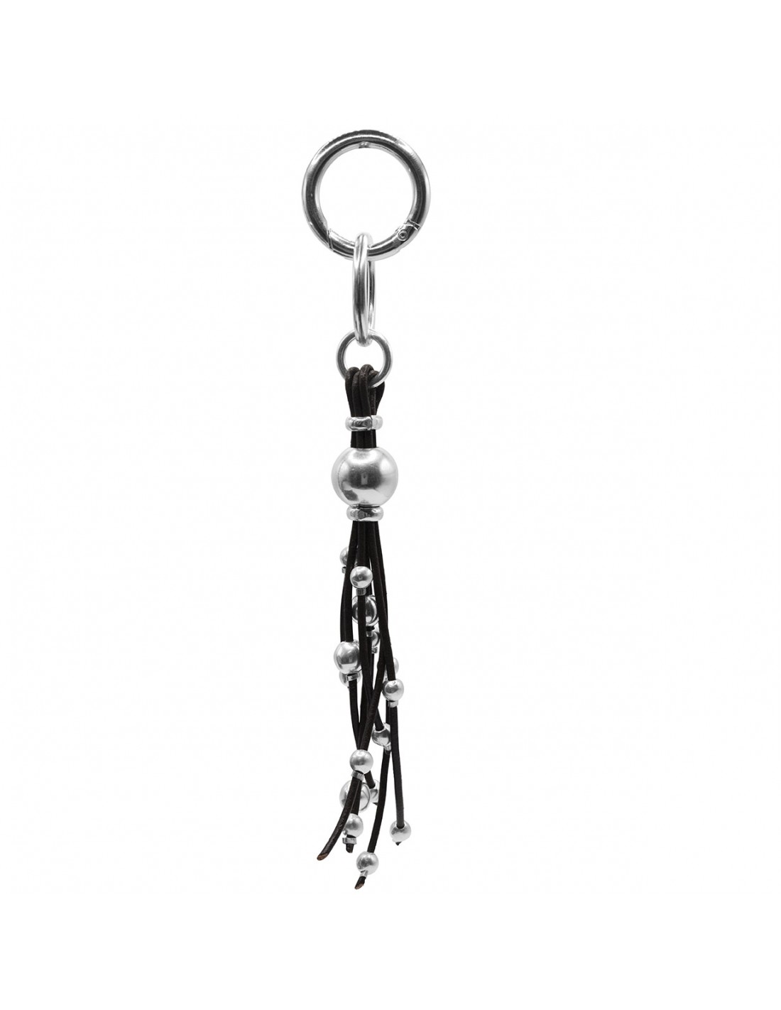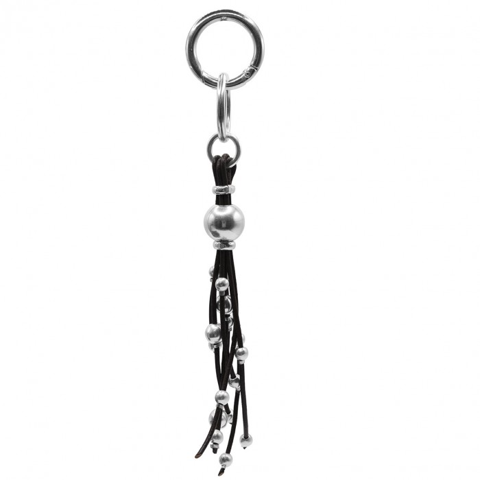 El Llavero o Bag Charm Ástrea está formado por varios cueros que caen como flecos, decorados con bolitas bañadas en plata y una esfera más grande que aporta presencia. Su cierre de mosquetón facilita colgarlo en el bolso y mide 21 cm, convirtiéndolo en un accesorio práctico, llamativo y lleno de personalidad.