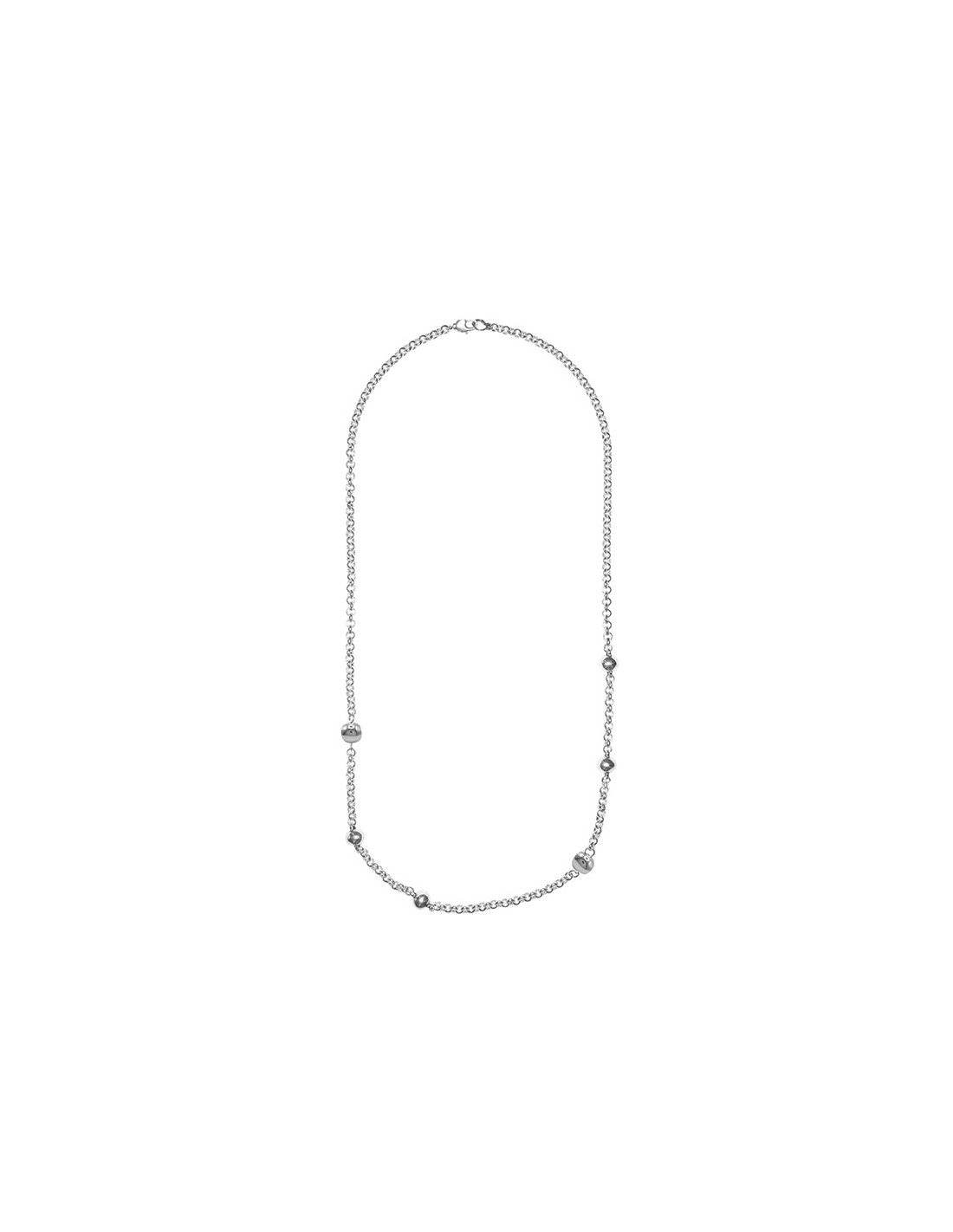 El Collar Maia está elaborado con cadena larga de eslabones medianos bañada en plata, combinando motivos de esferas de dos tamaños y cristales de Murano. Disponible en cinco colores, con cierre de mosquetón y longitud de 80 cm, es un collar versátil y sofisticado que aporta dinamismo y un toque contemporáneo a cualquier look.