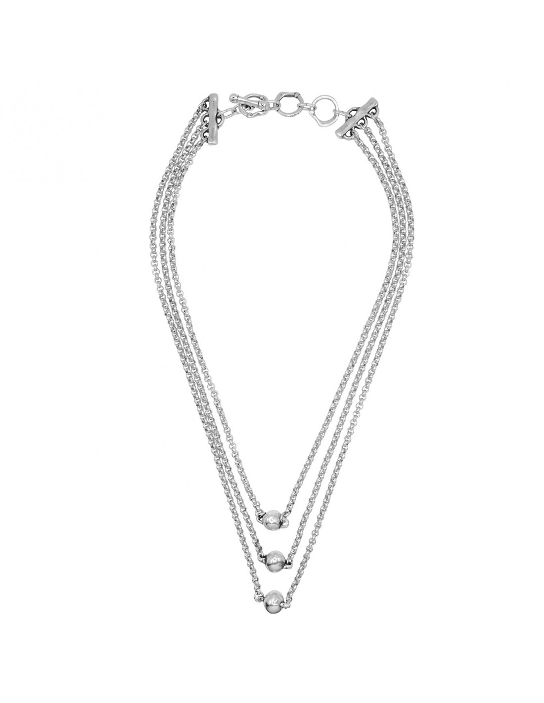 El Collar Eclipse está formado por tres cadenas en cascada, cada una con un motivo de esfera que puede ser de metal bañada en plata o de cristal de Murano. Disponible en cinco colores, con cierre en forma de T y longitud ajustable de 50 a 53 cm, es un collar versátil y contemporáneo que aporta dinamismo y estilo a cualquier look.