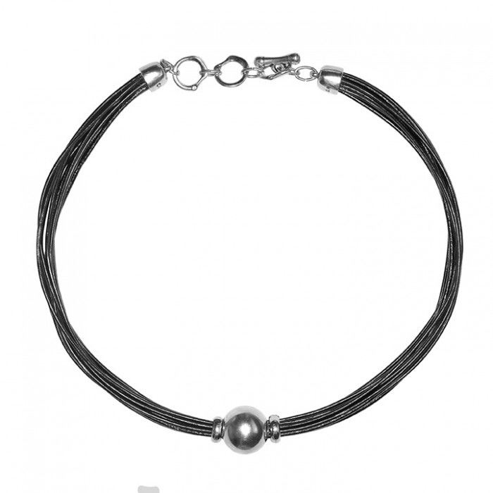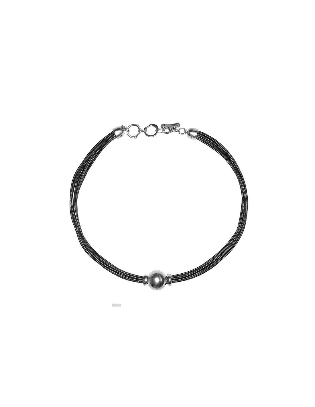 El Collar Juno combina baño de plata y varios cueros de distintos grosores que pasan por una esfera central, un diseño elegante y versátil.