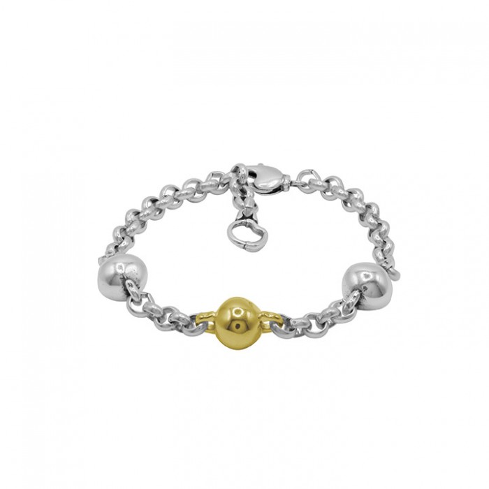 Pulsera con cadena de eslabones bañada en plata, diseñada con dos esferas plateadas y una esfera central bañada en oro que aporta contraste y luminosidad. Su cierre de mosquetón permite un ajuste cómodo de 17 cm a 21 cm, adaptándose a diferentes estilos y muñecas. Una joya versátil que une lo clásico y lo contemporáneo, ideal para llevar sola o combinar con otras pulseras de la colección.