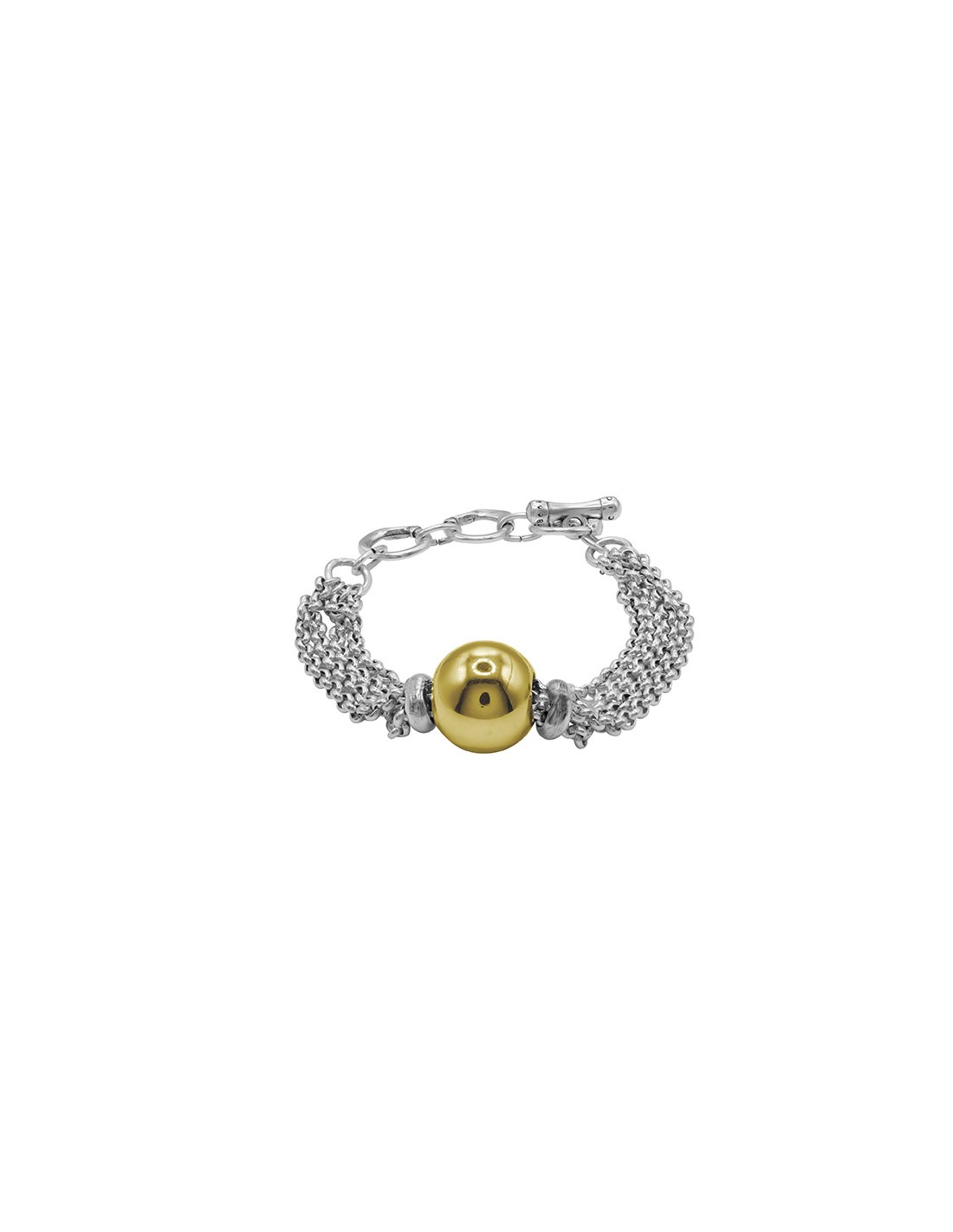 La Pulsera Spherik Gold está bañada en plata y compuesta por varias cadenas finas de eslabones que atraviesan una esfera central bañada en oro. El contraste entre los dos acabados aporta dinamismo, luz y un estilo contemporáneo. Su cierre en forma de T permite ajustarla cómodamente de 17 a 21 cm. Una joya versátil y sofisticada, ideal para dar un toque distintivo a cualquier look.
