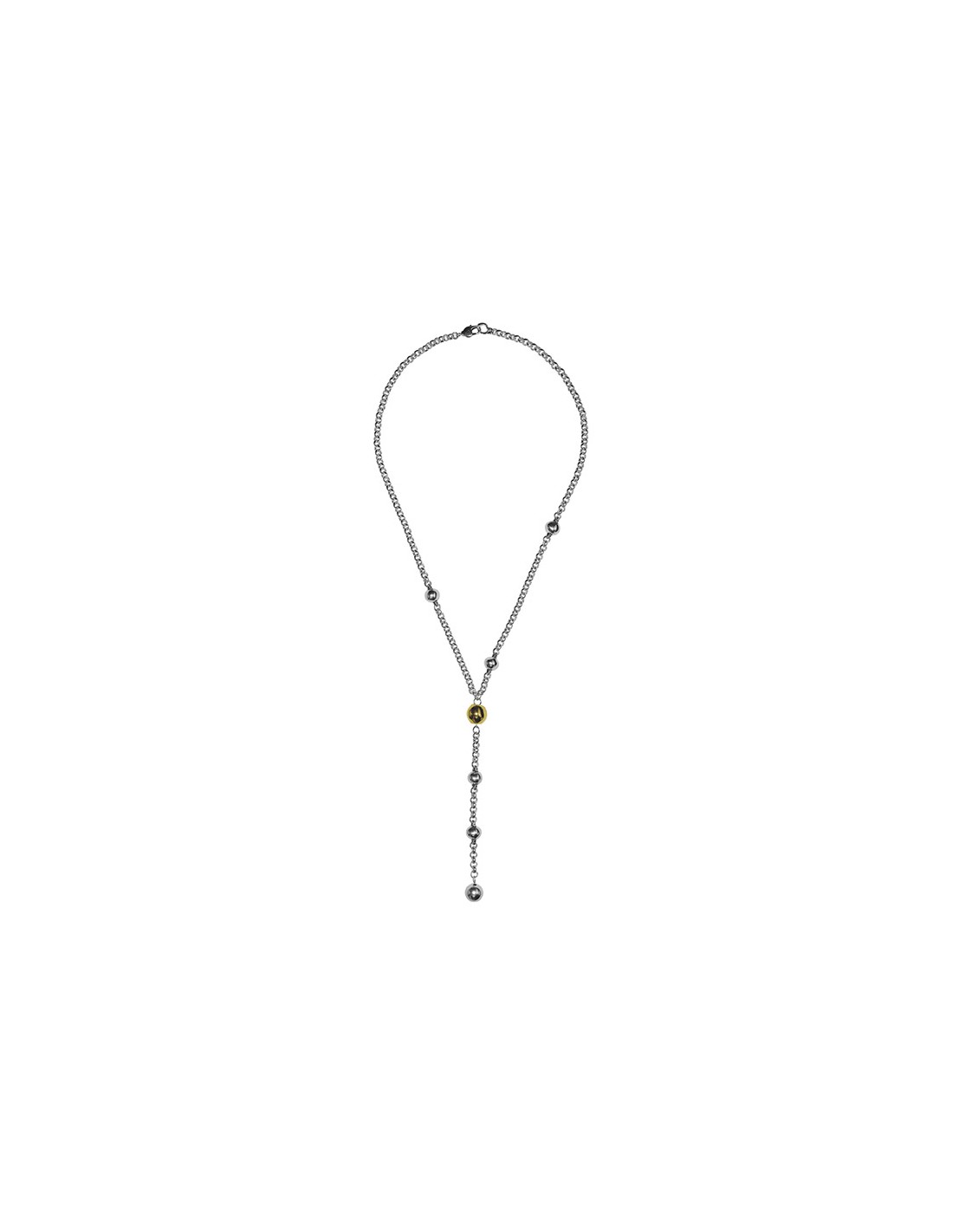 Collar Kermes Gold estilo corbatero con cadena en plata y esferas bañadas en plata y oro, versátil y sofisticado.