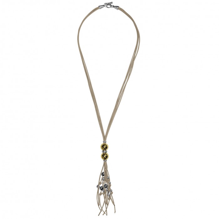 El Collar Volans Gold está formado por varios cordones de algodón encerado en color beige que caen como flecos en la parte inferior, decorados con esferas pequeñas y un motivo central de esferas grandes bañadas en oro. Con cierre en forma de T y longitud de 100 cm, es un collar llamativo y sofisticado, perfecto para aportar movimiento y estilo a cualquier look.