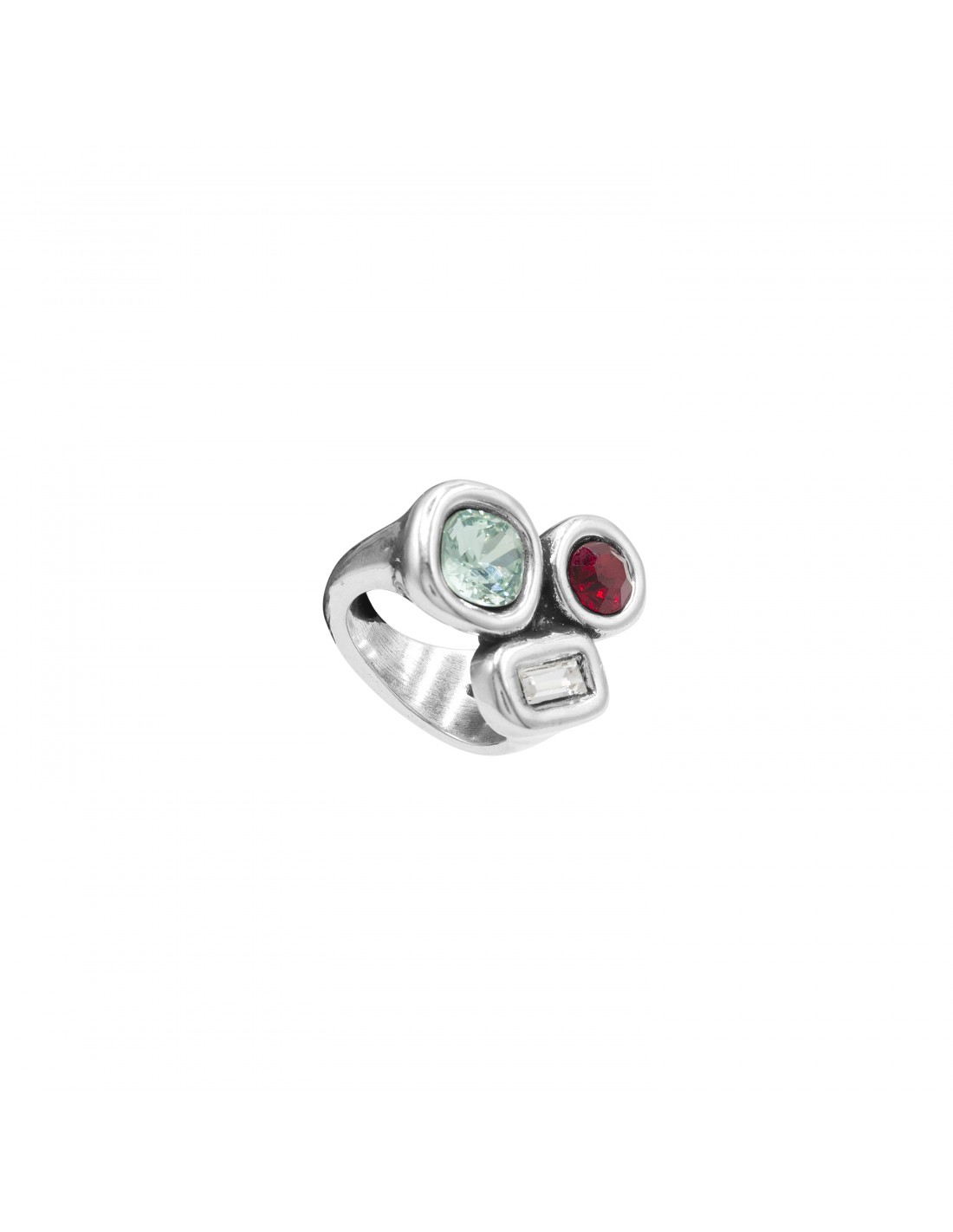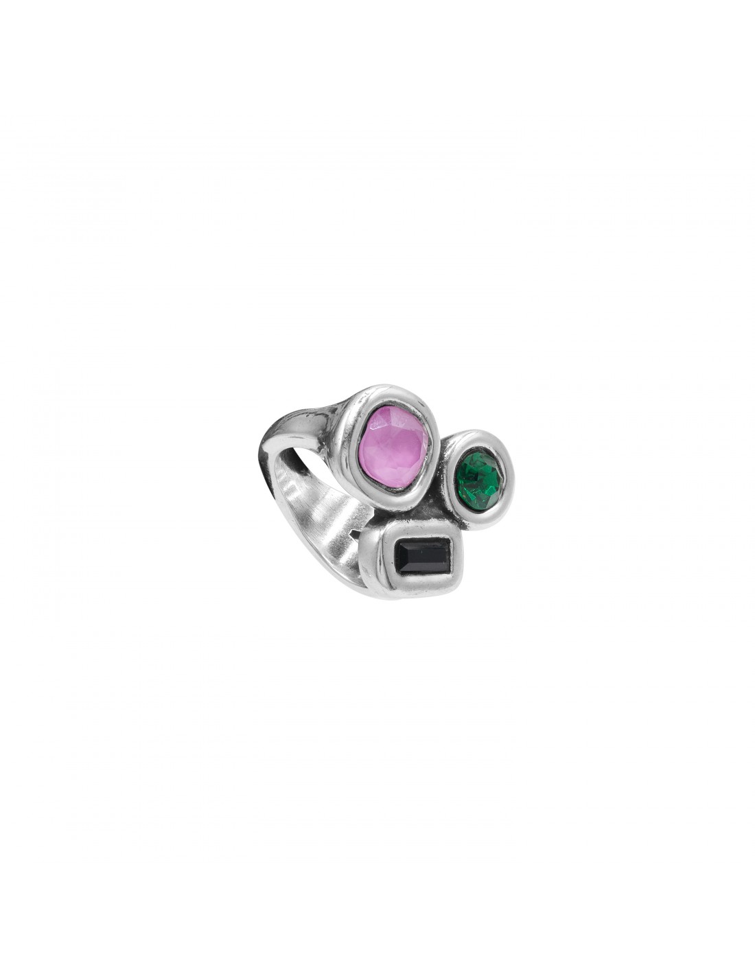 Anillo Collage combina piedras de cristal facetado en varias formas, bañadas en plata, que reflejan la luz con un brillo sutil y cambiante. Su diseño artesanal transmite dinamismo y sofisticación en un tamaño cómodo y elegante. Disponible en cuatro tallas, está fabricado a mano en Madrid cuidando cada detalle. Este anillo invita a complementar cualquier look con un toque de personalidad luminosa y refinada, perfecto para quienes buscan un estilo contemporáneo con delicadeza.