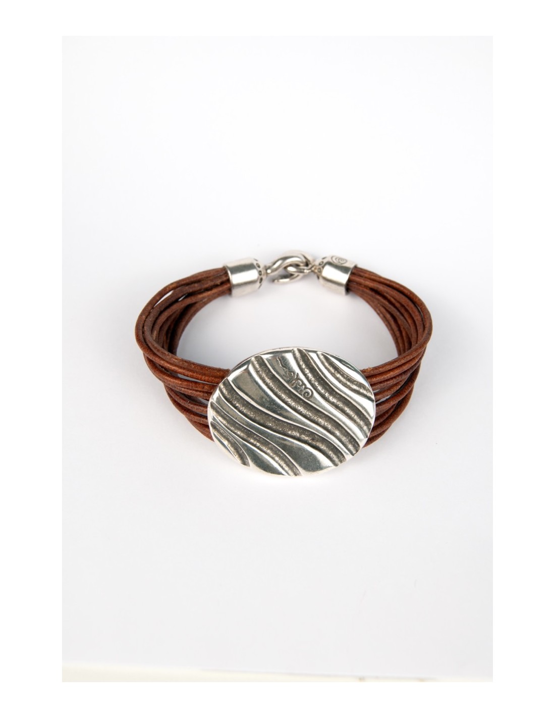 Un clásico que vuelve al juego. La pulsera Ondas combina varios cueros marrones con una pieza central ovalada de textura ondulada que aporta carácter sin esfuerzo. Cómoda, atemporal y con ese punto artesanal que conecta con todo tu look.