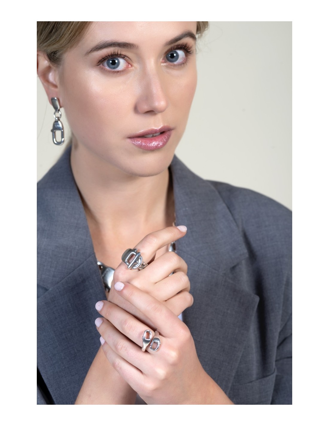 Destaca por su diseño de dos mosquetones cruzados, una forma escultórica que aporta carácter y fuerza visual. Su acabado en baño de plata refleja la luz con un brillo sobrio y elegante. Fabricado artesanalmente en Madrid, transmite una estética urbana y contemporánea. Disponible en dos tallas regulables, se adapta con comodidad y se convierte en un gesto personal, ideal para llevar a diario o regalar con intención.