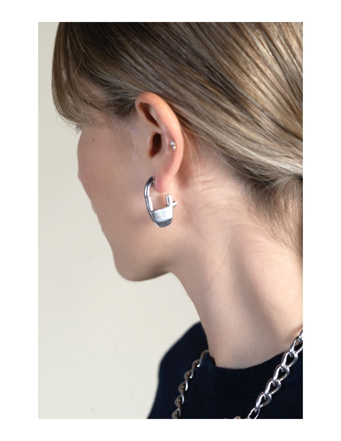 Los pendientes K2 presentan un motivo de mosquetón de líneas limpias y presencia equilibrada. Su baño de plata aporta un brillo suave que realza la forma sin excesos. Fabricados artesanalmente en Madrid, combinan carácter industrial y elegancia contemporánea. El cierre a presión asegura una sujeción cómoda y discreta. Una joya con identidad propia, pensada para acompañarte en el día a día o para regalar con intención.