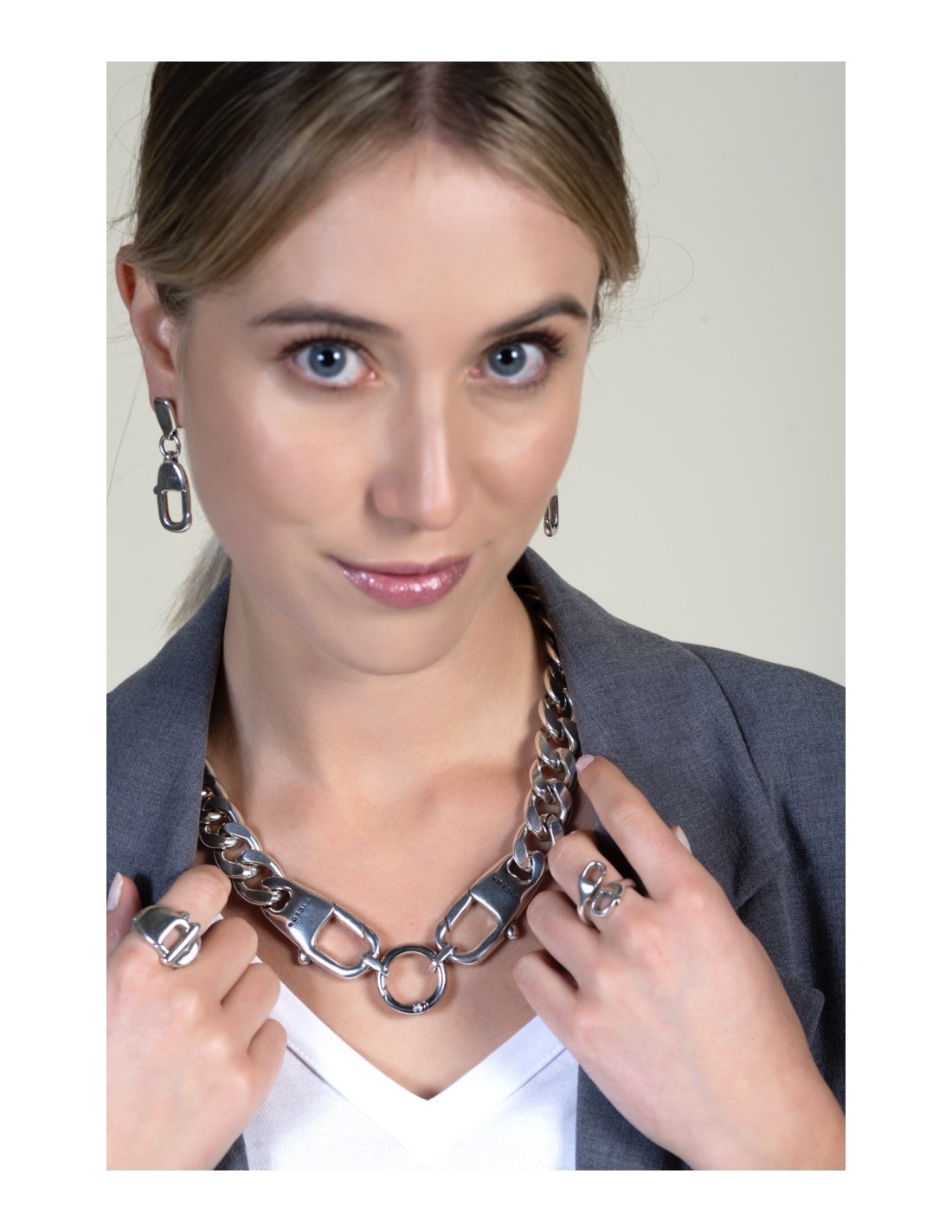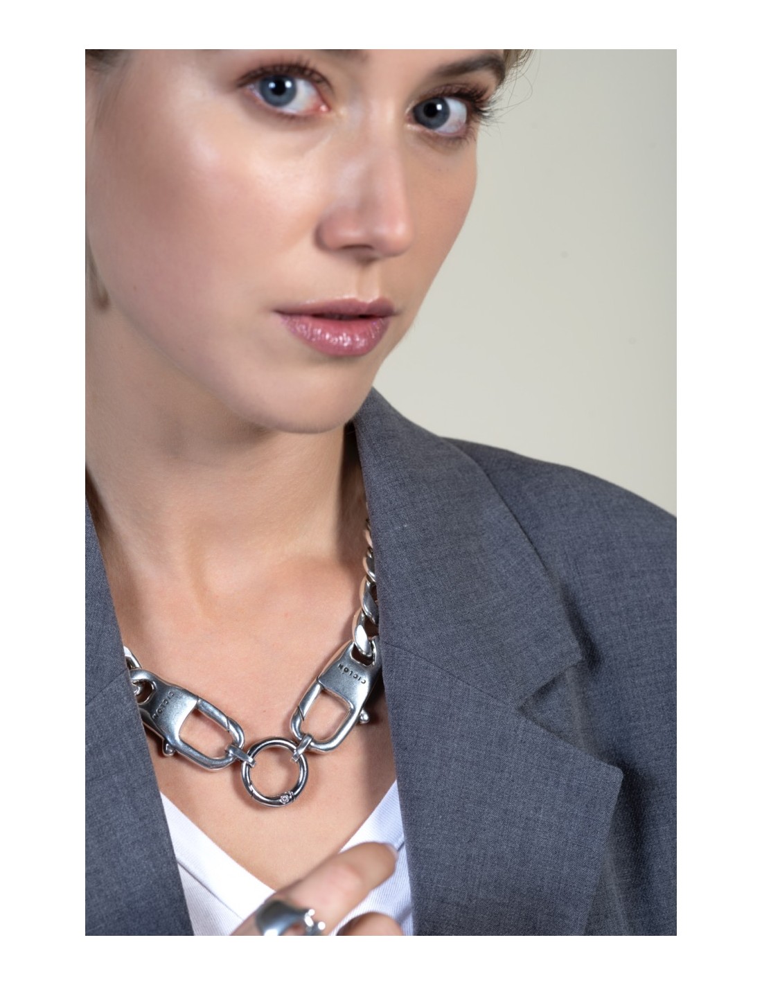 Es un collar corto de presencia contundente, con cadena de eslabones anchos y gruesos de 40 cm. Su diseño se articula en torno a dos mosquetones unidos por un tercero, creando un juego visual de fuerza y equilibrio. El baño de plata aporta brillo y profundidad al conjunto. Fabricado artesanalmente en Madrid, incorpora cierre de mosquetón y transmite una estética urbana, pensada para llevar con seguridad y estilo propio.