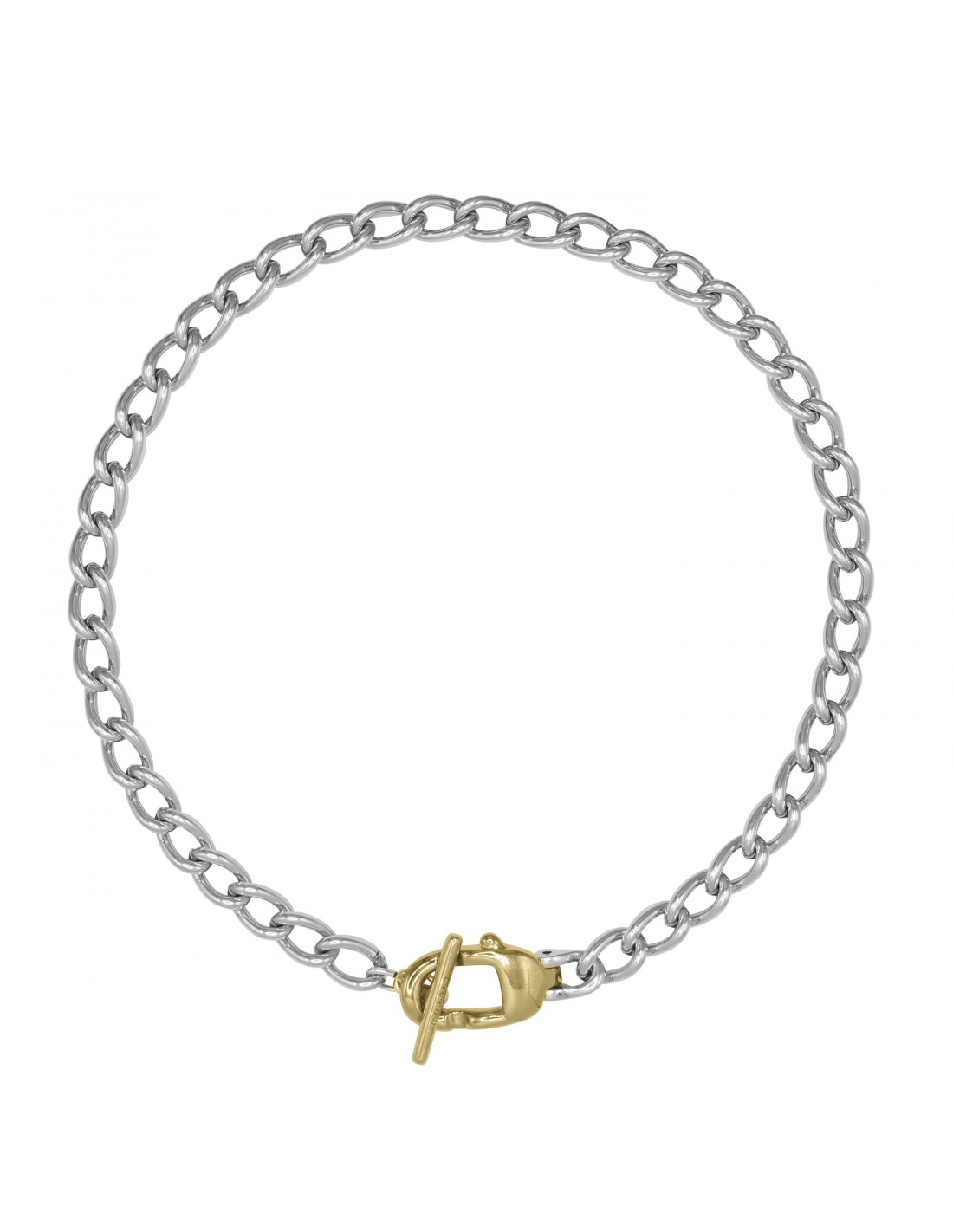 Collar Makalu Gold corto con cadena de eslabones anchos y motivo de mosquetón. Joya artesanal en baño de plata y oro, hecha en Madrid, con cierre de mosquetón y diseño actual.