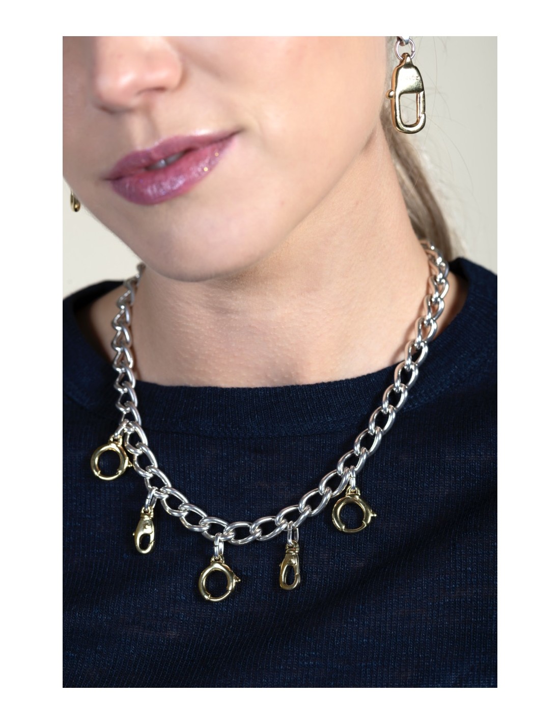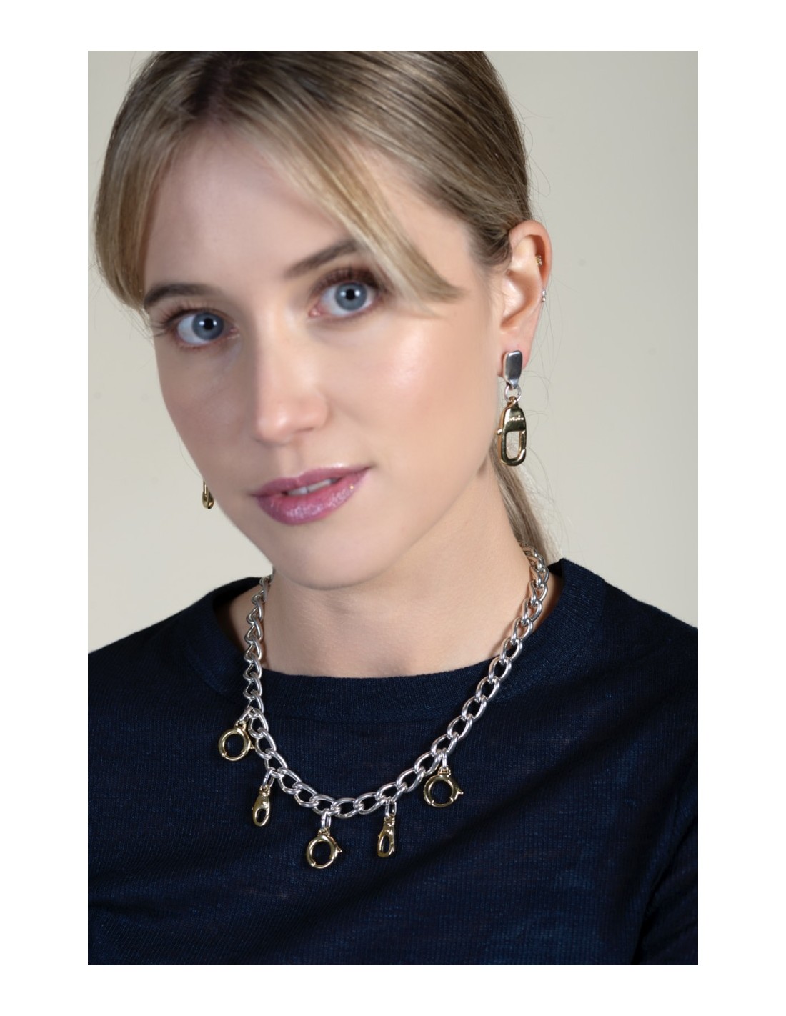 Es un collar corto con cadena ancha de grosor medio y charms colgantes con motivo de mosquetón que aportan ritmo y movimiento. Su baño de plata crea reflejos suaves que acompañan cada gesto. Fabricado artesanalmente en Madrid, mide de 40 a 43 cm y cuenta con un cierre en forma de T que se integra en el diseño. Una joya expresiva, pensada para llevar como protagonista.