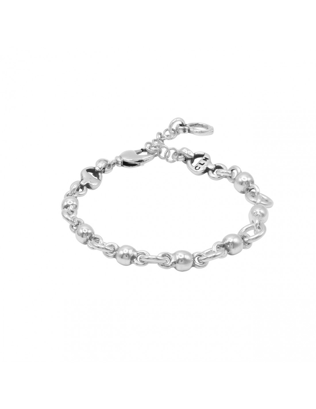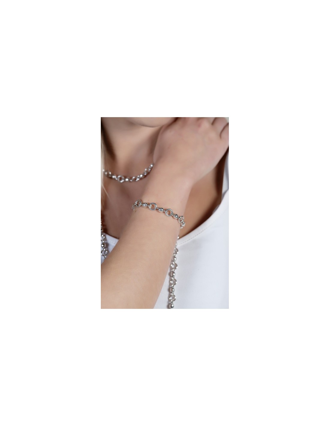 Una pulsera bañada en plata formada por una cadena de eslabones circulares unidos por una circunferencia central, que aporta armonía y delicadeza al diseño. Su brillo sutil resalta la muñeca con elegancia natural, mientras el cierre de mosquetón ofrece comodidad y seguridad. Fabricada artesanalmente en Madrid, destaca por sus acabados cuidados y su ligereza. Ajustable de 17 a 20 cm, es ideal para complementar looks diarios con estilo refinado o para regalar un detalle con significado.