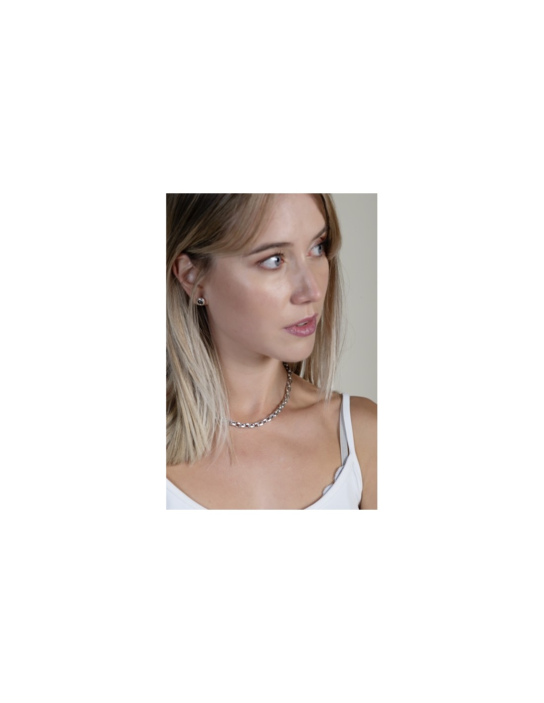 Collar Théa combina cadena de pequeños eslabones ovalados y baño en plata en un diseño artesanal hecho en Madrid. Ajustable y ligero, aporta brillo discreto y elegancia contemporánea, perfecto para uso diario o para regalar.