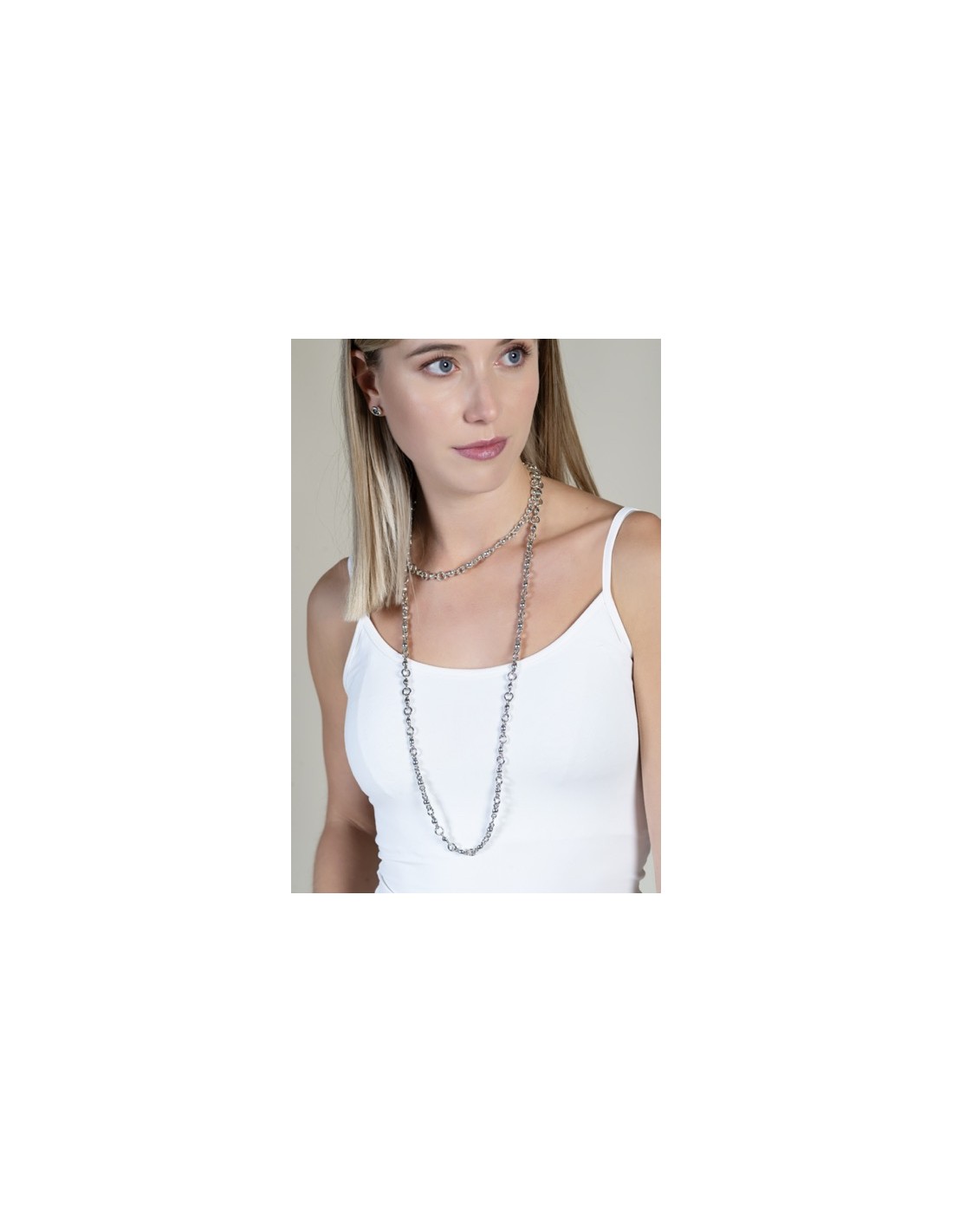 Un collar corto bañada en plata formado por una cadena de eslabones circulares unidos por una circunferencia central, que aporta armonía y delicadeza al cuello. Su brillo sutil resalta con elegancia natural, mientras el cierre de mosquetón garantiza comodidad y seguridad. Fabricado artesanalmente en Madrid, destaca por sus acabados cuidados y su ligereza. Ajustable de 40 a 45 cm, es perfecto para complementar cualquier look diario con un toque moderno o para regalar un detalle lleno de significado
