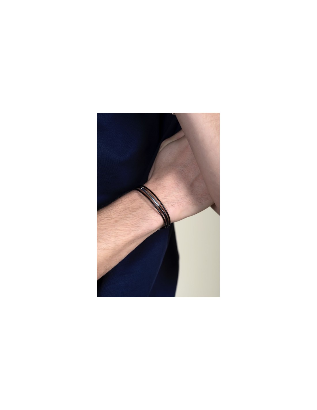Diseño elegante y sobrio, elaborado en cuero negro fino triple que envuelve la muñeca con delicadeza. El motivo alargado bañado en plata aporta un brillo sutil y moderno. Fabricada artesanalmente en Madrid, está disponible en dos tallas y cuenta con cierre de pato y alargador para un ajuste cómodo. Una pulsera que transmite estilo y fuerza discreta, ideal para lucir a diario o regalar con intención.