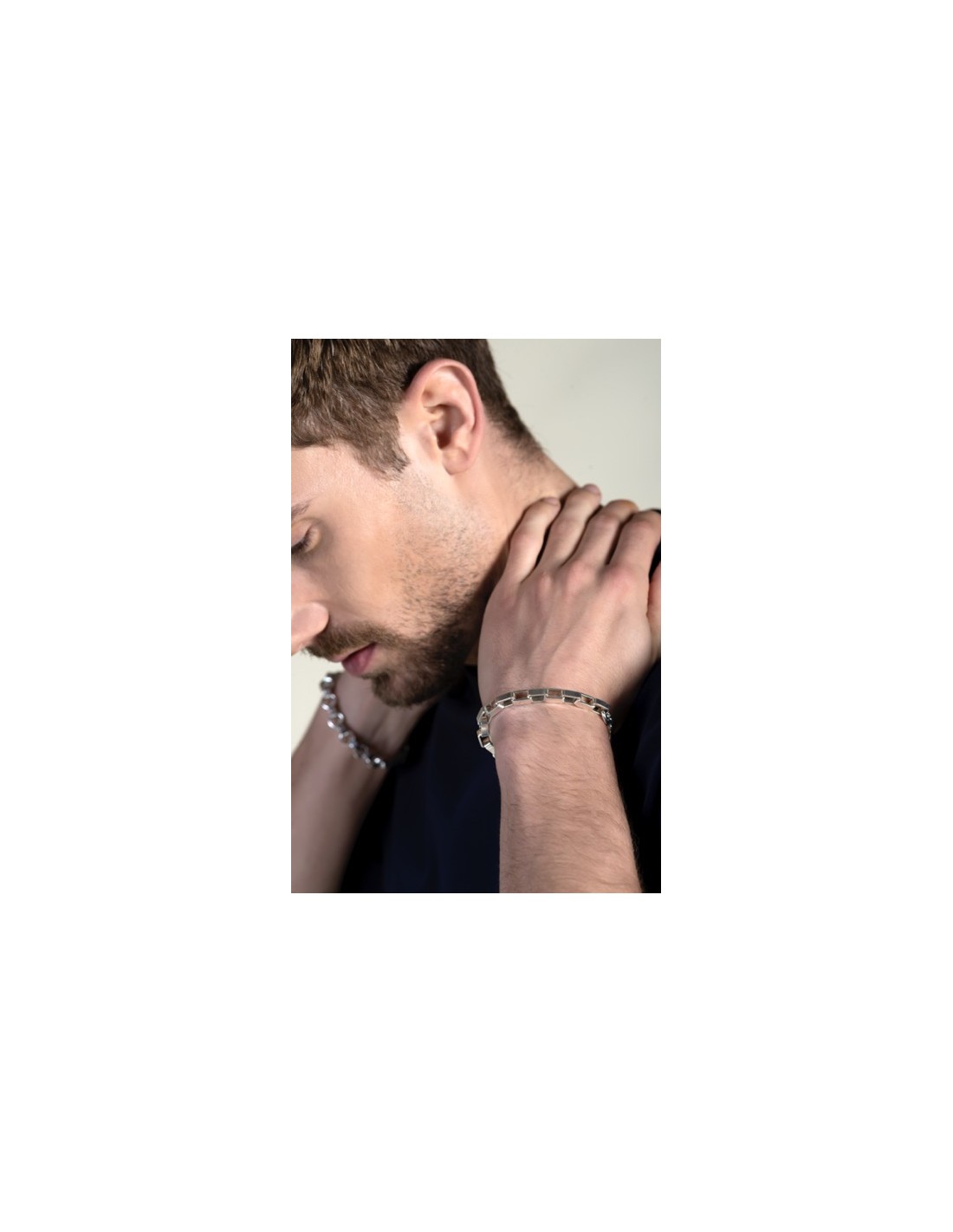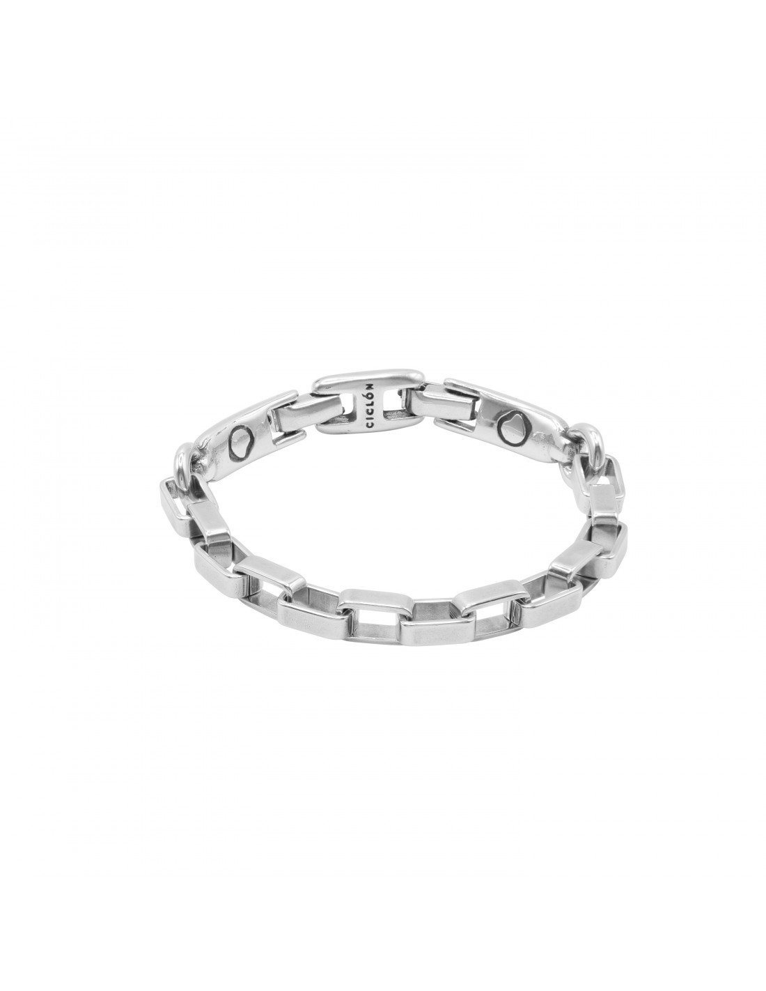 Un diseño moderno y refinado, con cadena de eslabones cuadrados bañada en plata que aporta geometría y brillo sutil sobre la muñeca. Fabricada artesanalmente en Madrid, está disponible en dos tallas y cuenta con alargador para un ajuste cómodo y seguro. Una pulsera pensada para lucir sola o combinada, que transmite estilo contemporáneo y versatilidad.
