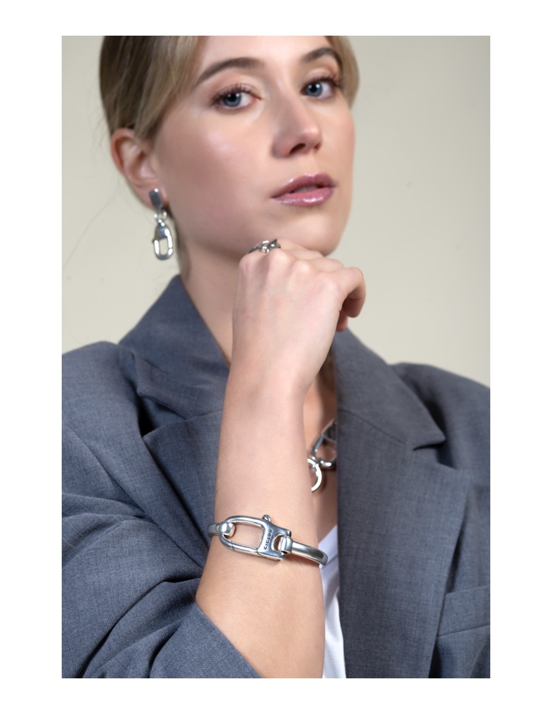 De líneas firmes y presencia elegante, esta pulsera rígida en baño de plata destaca por su motivo de mosquetón, integrado como cierre y detalle protagonista. Su acabado pulido refleja la luz con un brillo sutil, aportando carácter y equilibrio al conjunto. Fabricada artesanalmente en Madrid, transmite fuerza serena y estilo contemporáneo. Disponible en dos tallas, acompaña la muñeca con comodidad y personalidad. Una joya pensada para llevar a diario o regalar con intención.