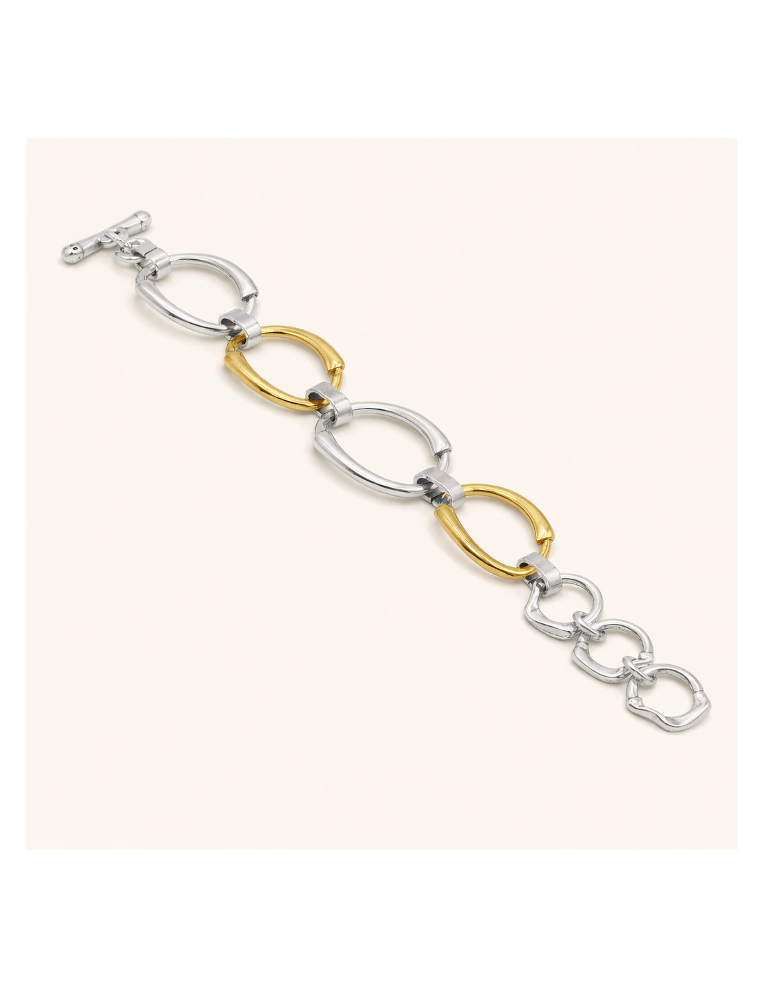 Pulsera Mini Espiral Oro. Delicada y ligera, formada por eslabones en forma de óvalo en dos tamaños que aportan ritmo y movimiento. Su baño de plata y oro le da un brillo sutil y contemporáneo. Fabricada artesanalmente en Madrid, cuenta con cierre en forma de T, práctico y con carácter. Con un tamaño ajustable de 15 a 18 cm, esta pulsera transmite estilo y personalidad, perfecta para combinar con otras joyas o para lucir sola con elegancia discreta.