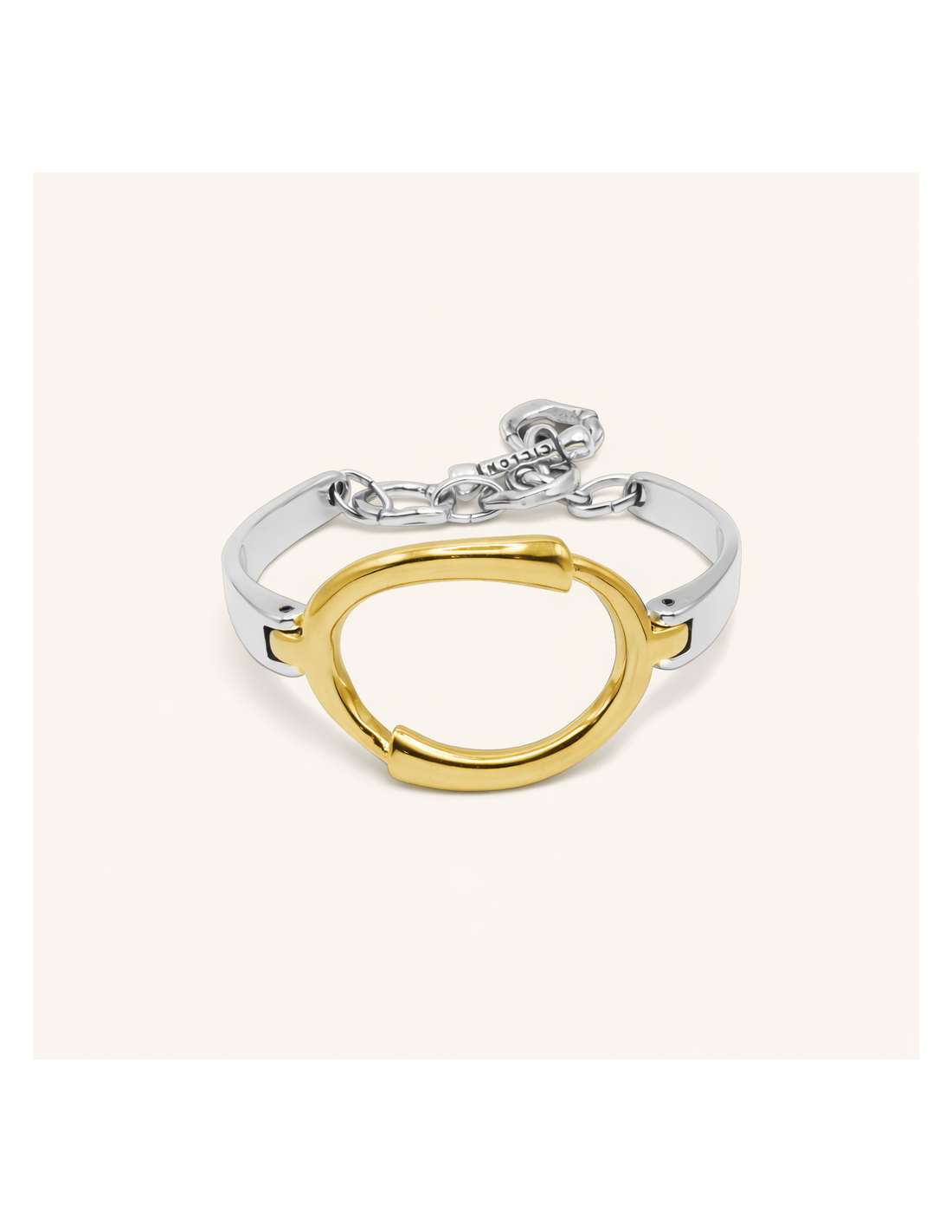 Pulsera Bucle Oro. Combina modernidad y delicadeza en su forma de óvalo semi rígido. El baño de plata y oro refleja la luz suavemente, aportando un brillo elegante y natural. Fabricada artesanalmente en Madrid, su acabado pulido asegura comodidad y estilo, adaptándose a muñecas de 15 a 18 cm. Con cierre en forma de T, transmite personalidad y sofisticación sin esfuerzo. Ideal para lucir sola o combinada, invita a sentir la joya y a regalar un detalle con significado y estilo.