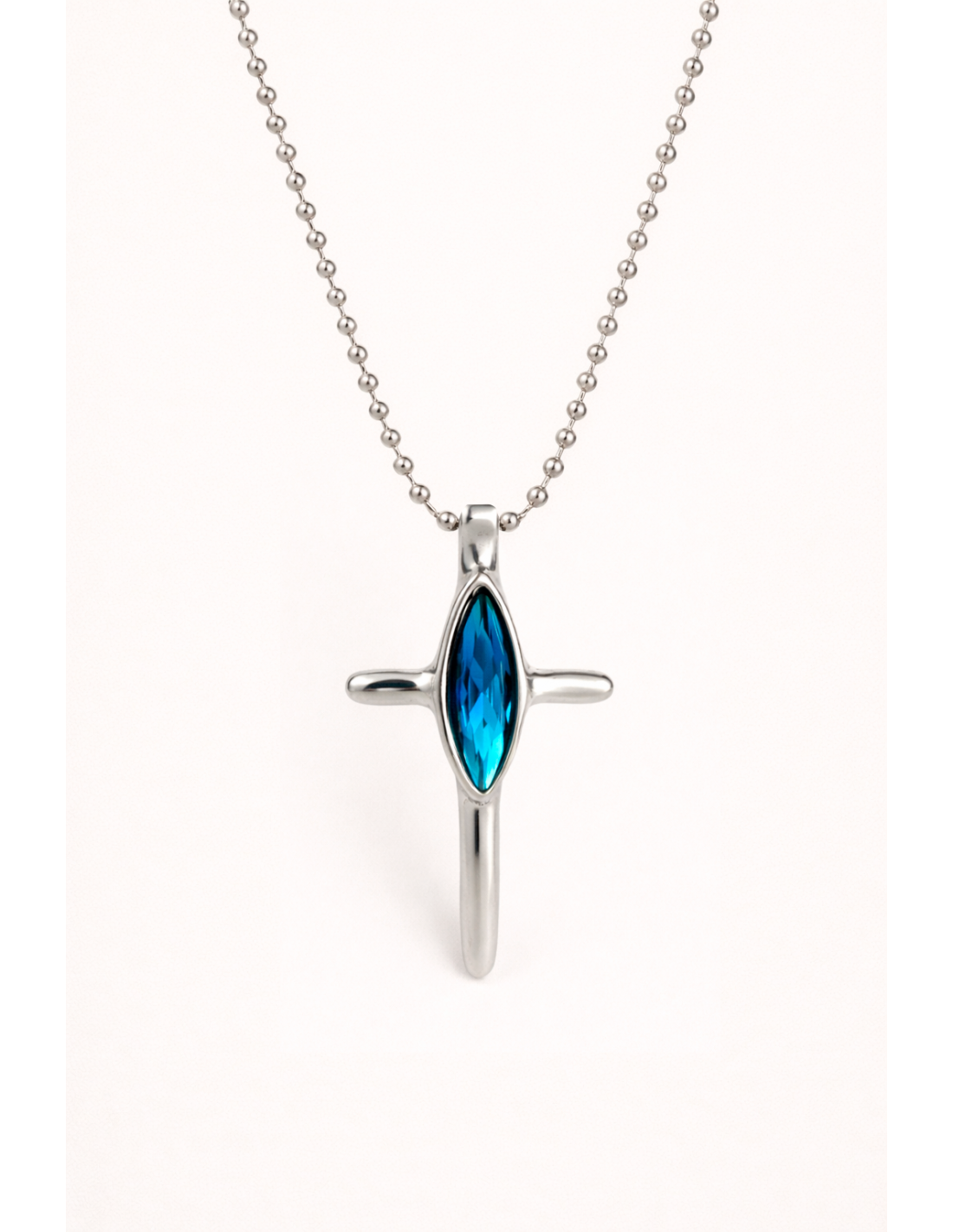 Collar Divina es un collar largo de acero con cadena de bolas y una cruz de 9 cm con piedra facetada en tres colores. Artesanal y luminoso, aporta calma, estilo y significado al look.