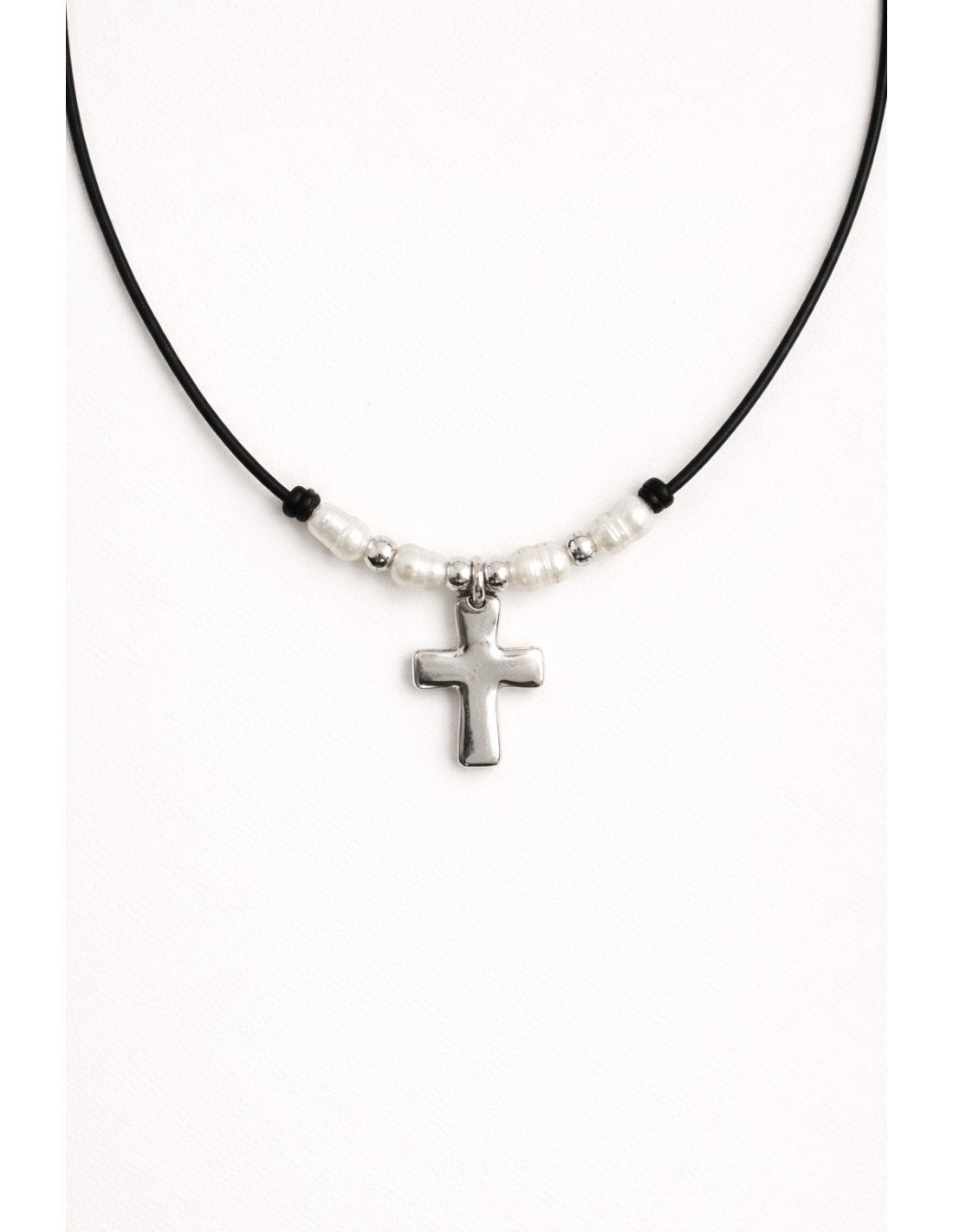 Collar Origen es un collar corto de cuero con bolas perladas y cruz lisa de 2,5 cm en baño de plata. Artesanal, elegante y delicado, aporta un toque de estilo y significado a tu look.