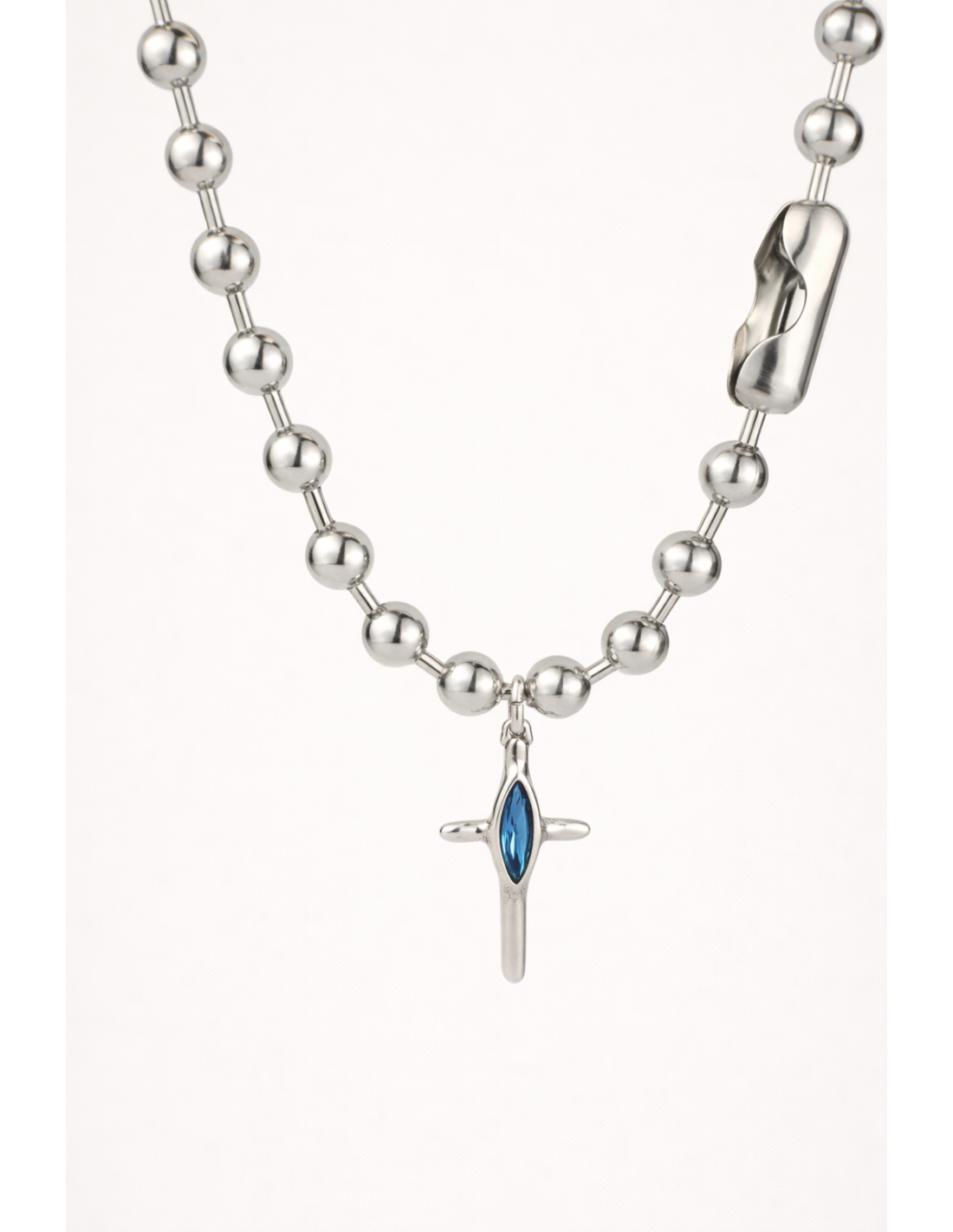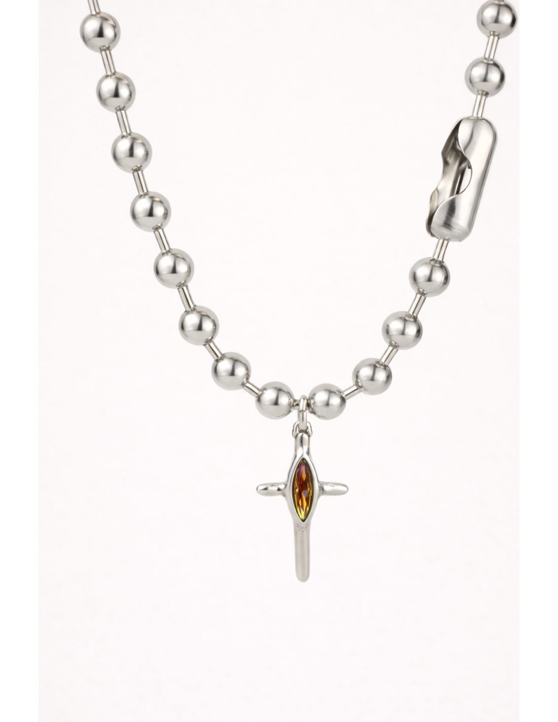 Collar Verdad destaca por su presencia y brillo en un diseño corto de 50 cm. Su cadena de bolas grandes de acero aporta textura y fuerza, mientras que la cruz de 3,5 cm en baño de plata con cristal facetado en tres colores refleja la luz con delicadeza. Fabricado artesanalmente en Madrid y con cierre hormiga, transmite personalidad y elegancia. Una joya que aporta carácter al look diario y se convierte en un símbolo que acompaña con estilo y significado.