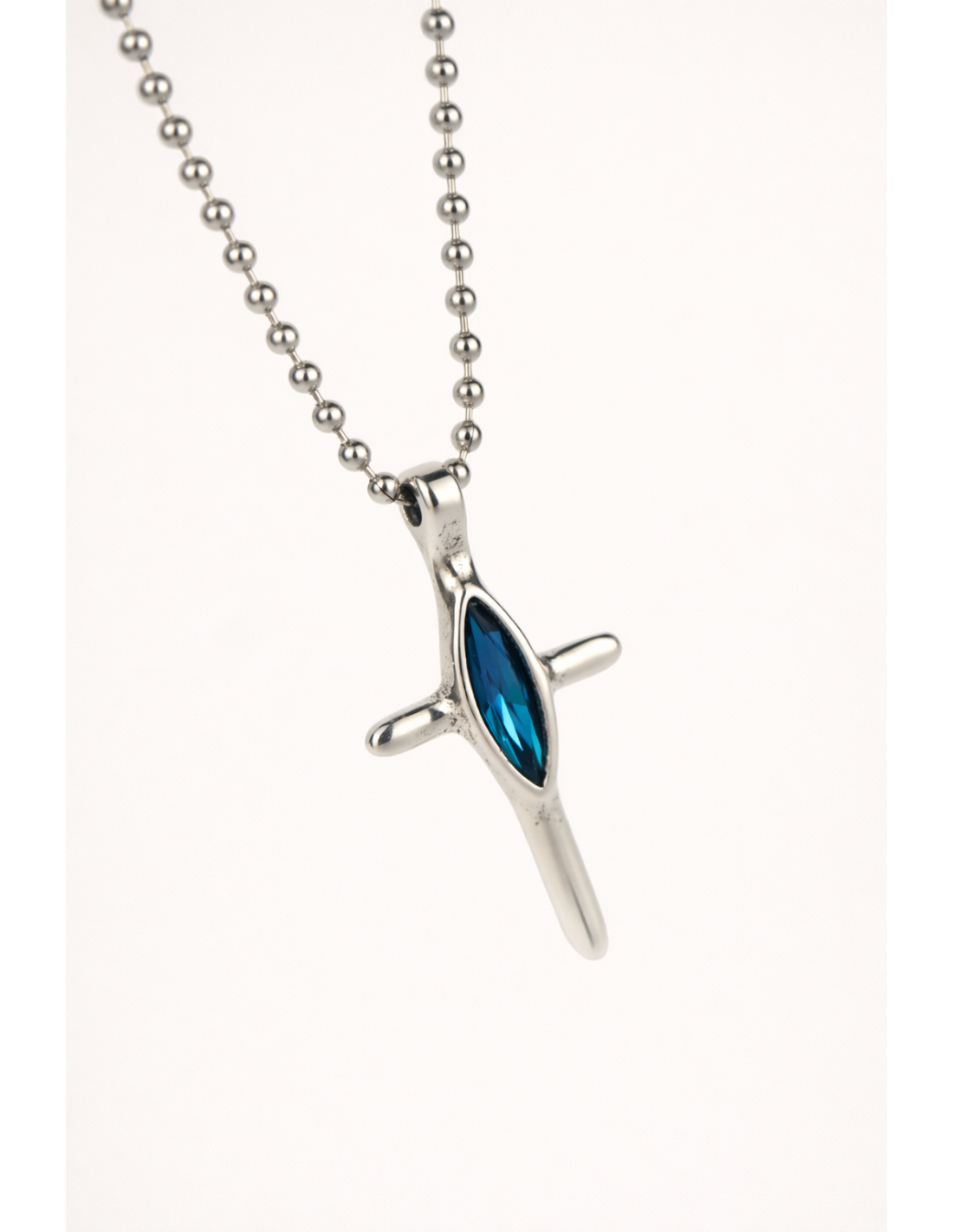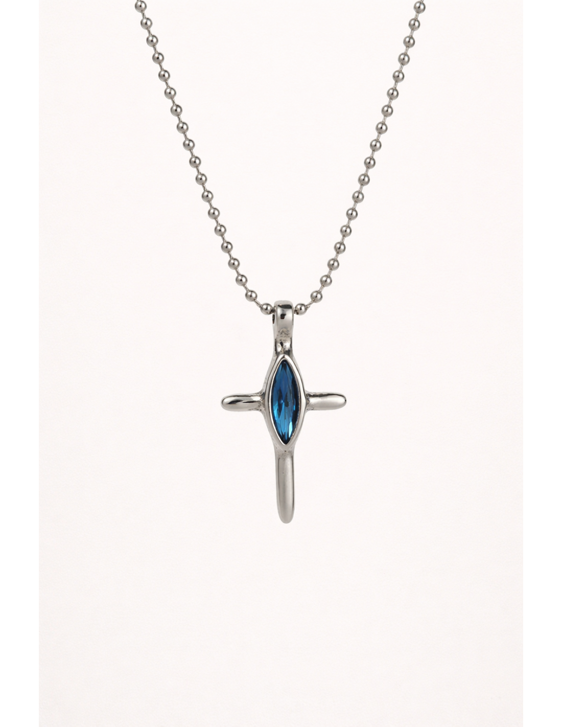 Collar Pureza es un collar corto de acero con cadena de bolas extra pequeñas y cruz de 3,5 cm en baño de plata en tres colores. Artesanal, elegante y delicado, aporta brillo y estilo refinado.