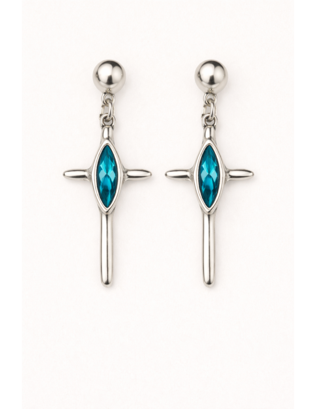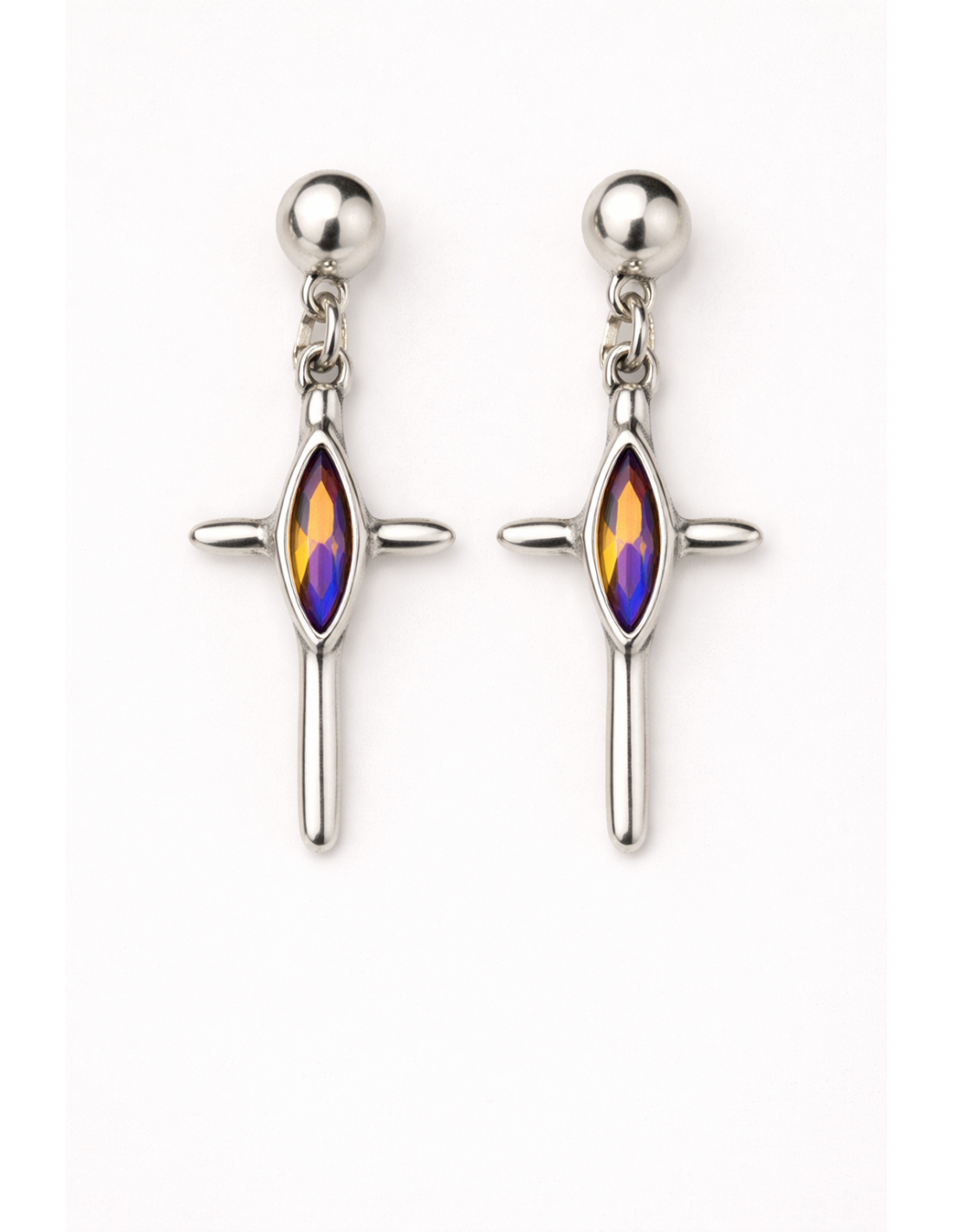 Pendientes Aura destacan por su brillo y movimiento en un diseño largo de 5 cm. Con baño de plata, presentan una cruz con cristal facetado en tres colores que refleja la luz con delicadeza y aporta un toque luminoso. Su cierre a presión garantiza comodidad y seguridad al llevarlos. Fabricados artesanalmente en Madrid, son ideales para añadir elegancia y simbolismo a cualquier look, o para regalar una pieza que combina estilo, luz y significado.
