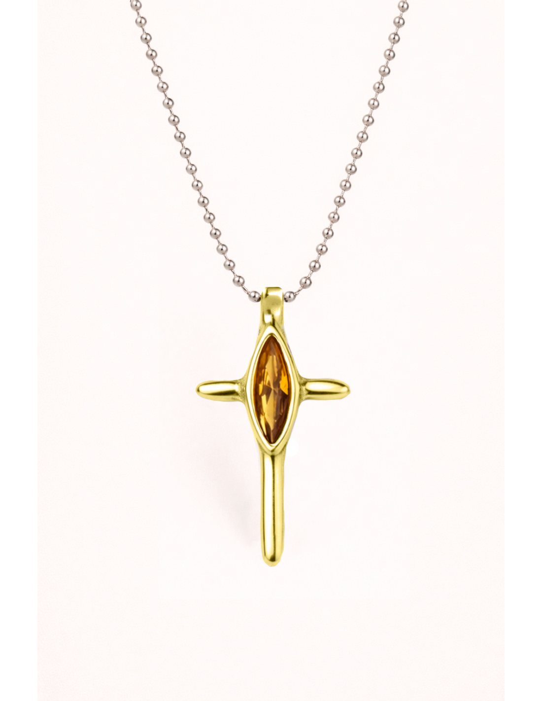 Collar Oro Pureza. Collar largo de cadena con bolas pequeñas de acero que cae con suavidad y movimiento. El motivo de cruz de 5 cm, con baño de oro y piedra facetada, refleja la luz con un brillo delicado y sofisticado. Mide 80 cm y se cierra con una hormiga para un ajuste seguro. Fabricado artesanalmente en Madrid, combina presencia y ligereza en una pieza que transmite calma y fuerza. Ideal para llevar sobre prendas sencillas o como capa con otras joyas.