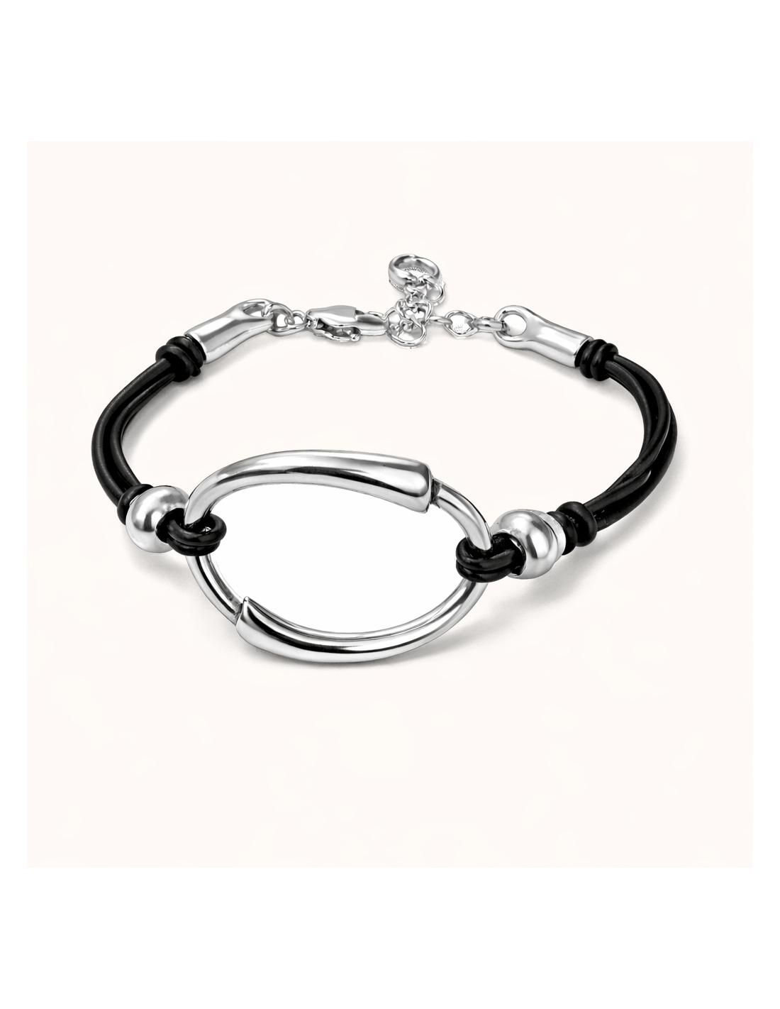 La pulsera Rizo, de doble cordón de cuero, con motivo central ovalado bañado en plata. Un diseño contemporáneo que combina fuerza y elegancia en una pieza versátil y fácil de combinar.