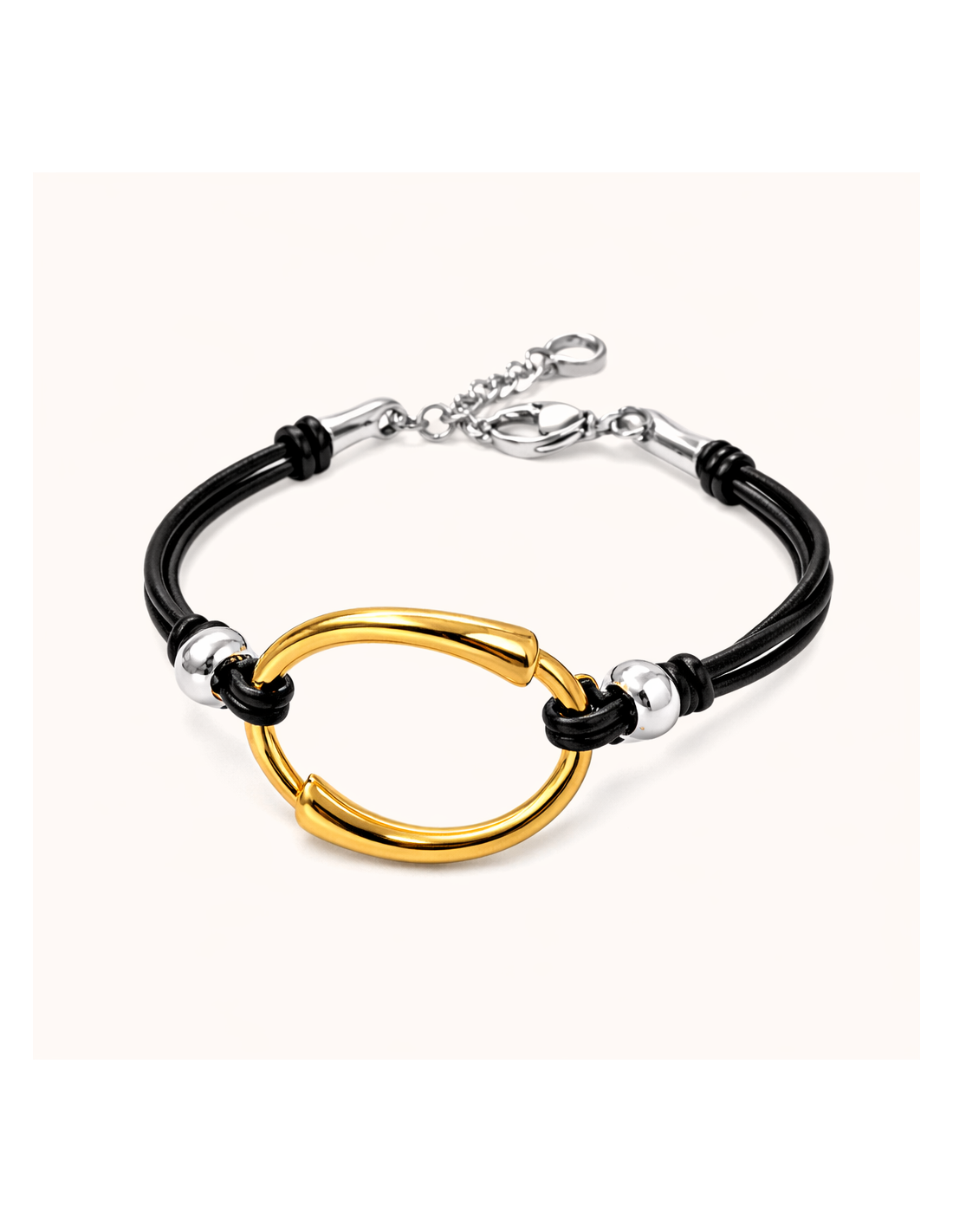 Pulsera Rizo Gold de Ciclón Jewelry en doble cordón de cuero negro con motivo central ovalado bañado en oro. Un diseño contemporáneo que combina contraste, volumen y carácter.