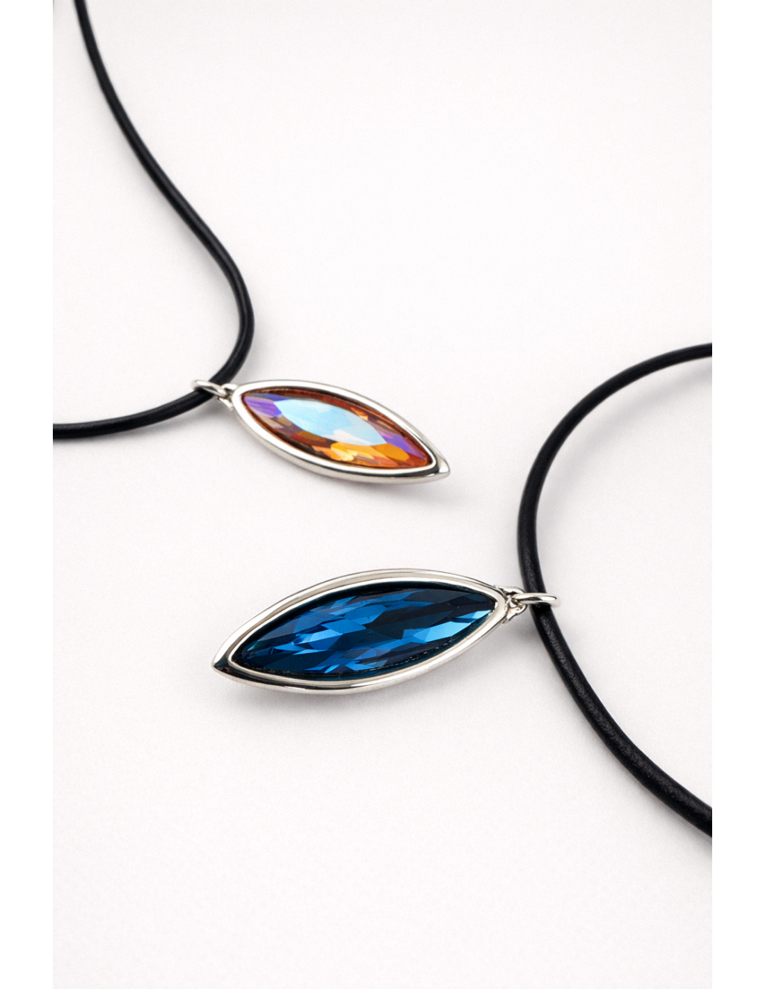 Collar Hoya de cuero liso con vaina de 4 cm y cristales facetados en tres colores. Ajustable 40–45 cm, cierre en T y diseño artesanal elegante.