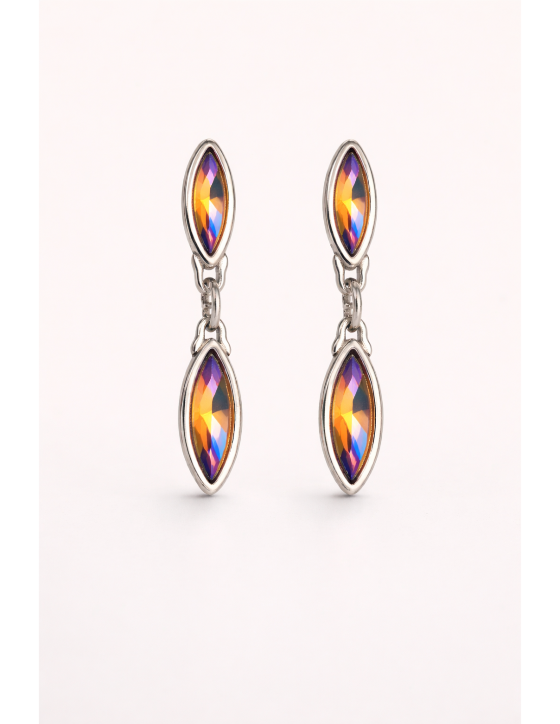 Pendientes Iris combinan delicadeza y luz en un diseño de 4 cm. Su motivo de vaina doble, acompañado de cristales facetados en tres colores, crea un sutil juego de reflejos que ilumina el rostro con elegancia. Bañados en plata y con cierre a presión, ofrecen comodidad y seguridad. Fabricados artesanalmente en Madrid, son ideales para aportar un toque refinado y sofisticado a tu estilo, perfectos para momentos especiales o para realzar tu look diario con un detalle luminoso.