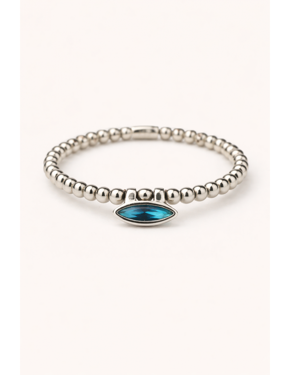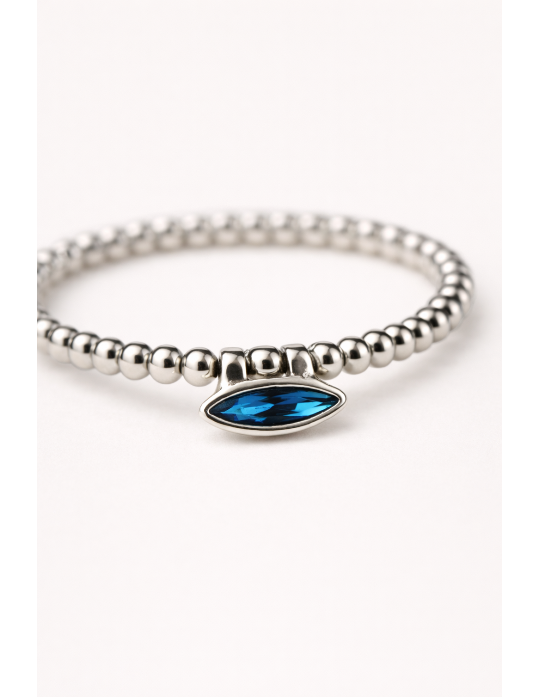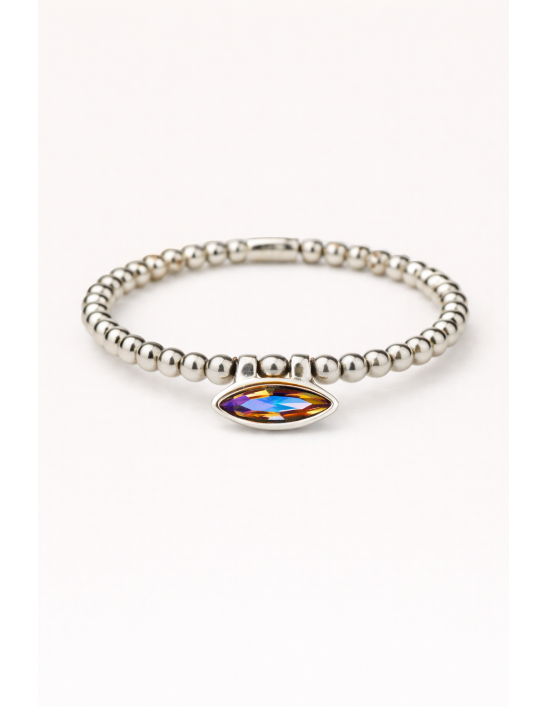 Pulsera Cala combina dinamismo y brillo en un diseño elástico cómodo y versátil. Sus bolas de acero se alternan con un motivo de vaina bañado en plata y cristal facetado en tres colores, creando un juego de luz elegante y moderno. Disponible en dos tallas, se adapta con facilidad a la muñeca. Fabricada artesanalmente en Madrid, es una joya que aporta estilo, color y personalidad a cualquier look, perfecta para usar sola o combinar con otras piezas.