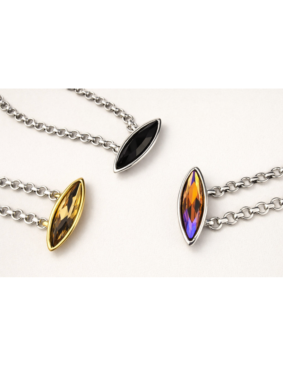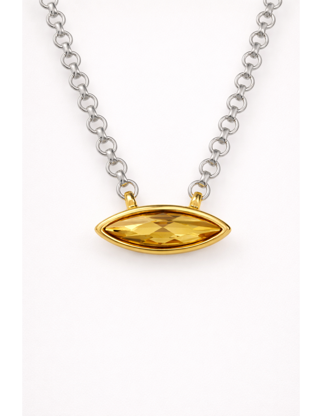 Collar Cala Oro corto con cadena de anillas planas bañada en plata y oro, motivo vaina con piedra facetada. Ajustable, artesanal y elegante, aporta brillo y estilo único.