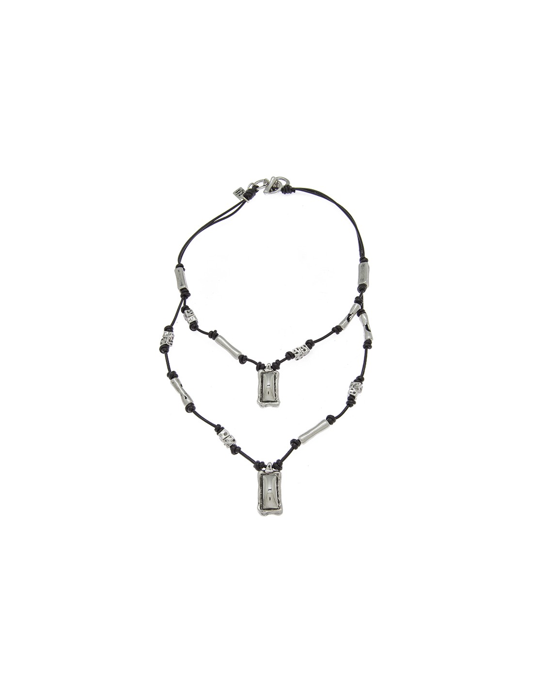 Collar largo de doble vuelta en cuero negro con  diferentes piezas de metal bañados en plata y pieza central pepergamino con cristal de Murano. Un diseño elegante elaborado por Ciclón y realizado de manera artesanal en nuestras instalaciones de España. Nuestros controles de calidad en componentes y baños garantizan todas nuestras piezas durante 2 años