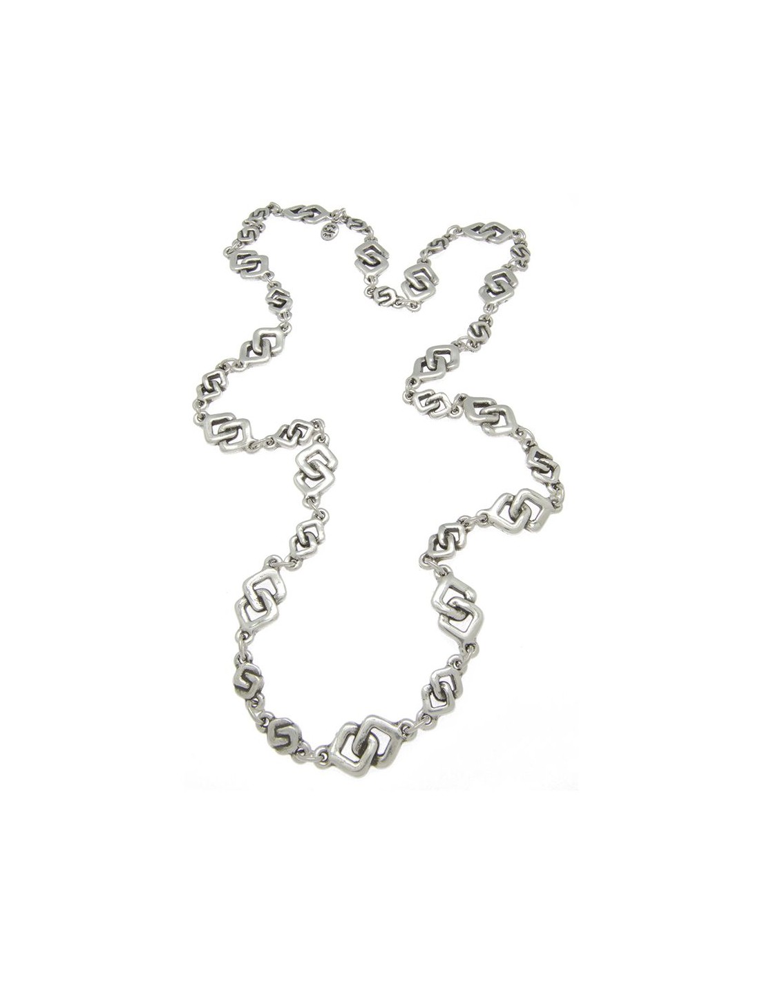 Collar largo  de metal bañado en plata, en eslabón con diferentes piezas. Destaca el innovador diseño  de esta sofisticada pieza. Esta joya ha sido realizada por Ciclón de manera totalmente artesanal en nuestras instalaciones de España. Nuestros controles de calidad en componentes y baños garantizan todas nuestras piezas durante 2 años